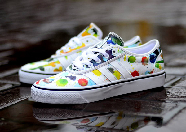 Adidas Skateboarding s’est associé avec HVW8, une galerie d’art underground basée à Los Angeles pour concevoir une paire. Kevin Lyons, un artiste que l’on ne présente plus (c’est à lui que nous devons les illustrations sur le site de Colette), a aussi participé au projet. Sa touche est reconnaissable grâce au dessin se trouvant sur la languette. Pour le reste, la Adi Ease se compose de cuir synthétique couvert par des taches de peintures. Elle est en vente (85 euros) chez Adidas.fr : voir la paire.