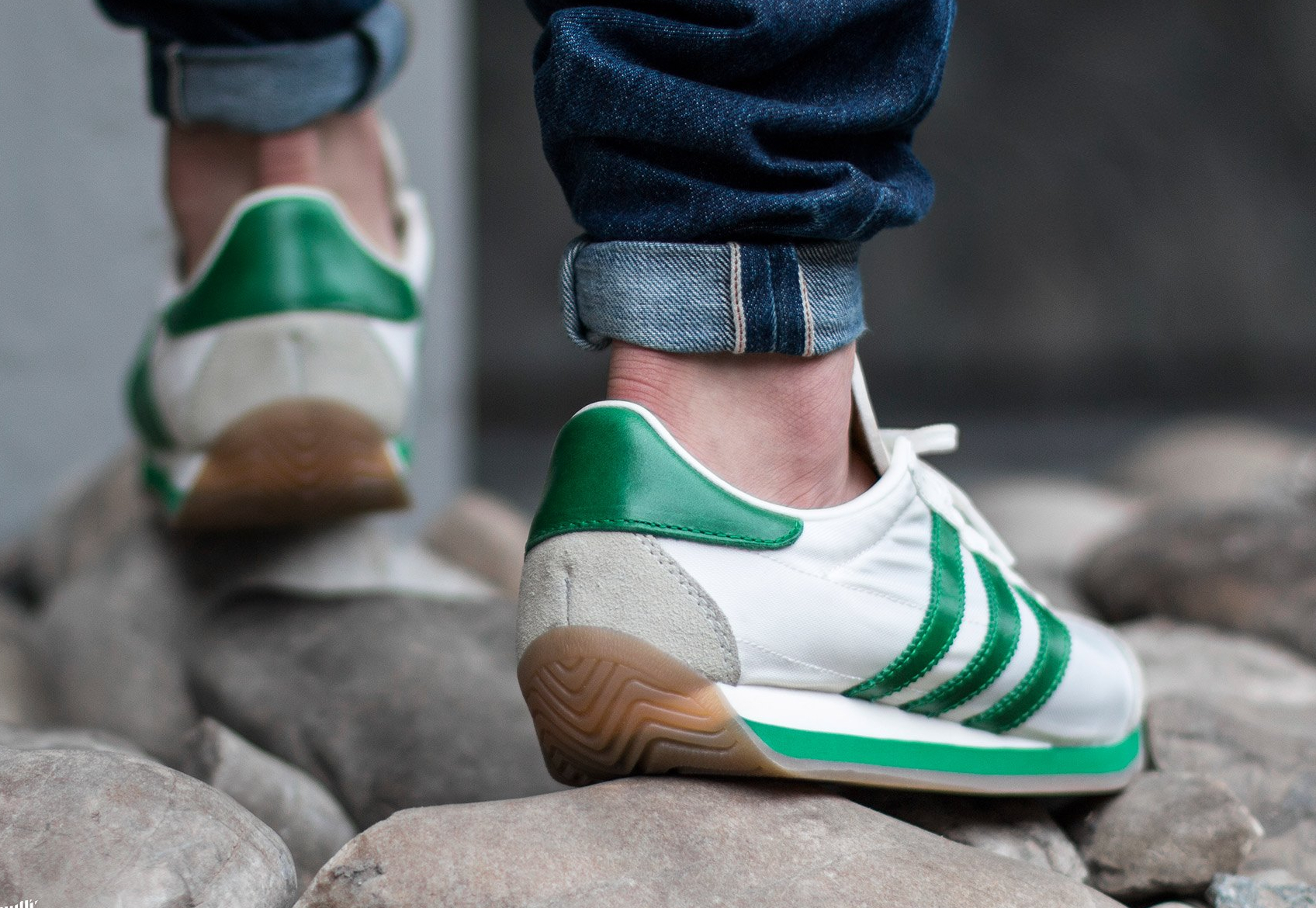 Je sais déjà que les aficionados des running vintage se félicitent du come back de la Adidas Country OG. La sneaker de 1970 renaît de ses cendres sous sa forme originelle : trois bandes vertes, empeigne blanche et semelle en gomme.