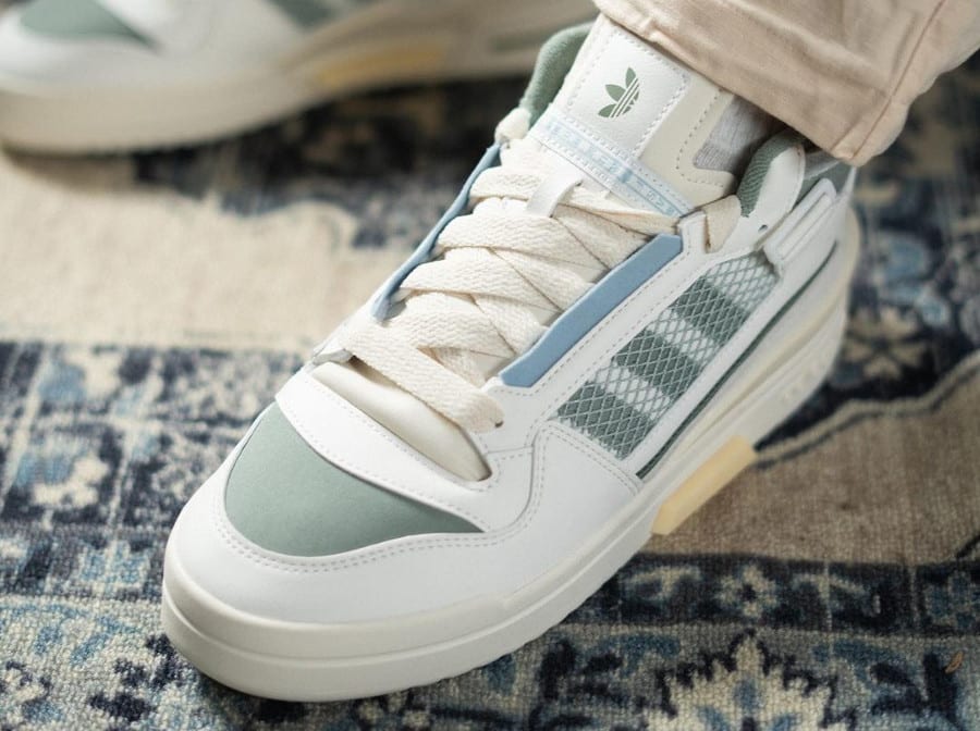 adidas Originals a complément négligé la adidas Forum Mod Mid. La Cloud White Silver Green Wonder Blue, un puissant coloris sorti l’an dernier, est déjà en promotion. Et ce, une semaine avant les soldes d’hiver 2024. A la vue des photos on feet de ce coloris mêlant blanc cassé, vert pâle et bleu pastel, cette situation parait incompréhensible. Pourtant, cette nouvelle version de la chaussure de basketball de 1984 dispose d’une sérieuse carte de visite :