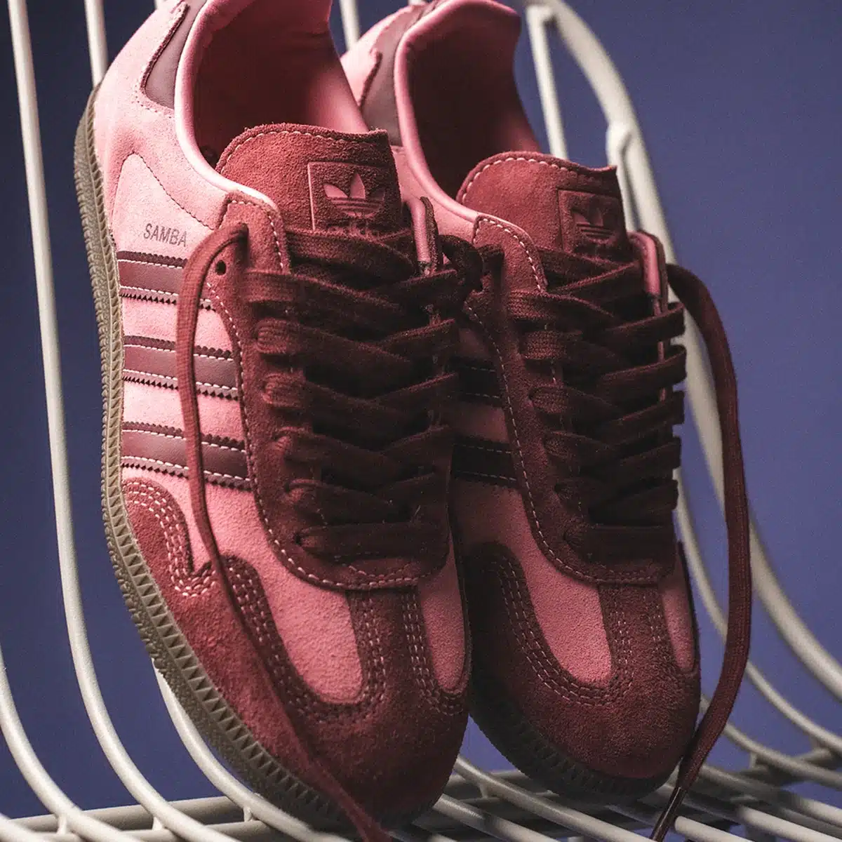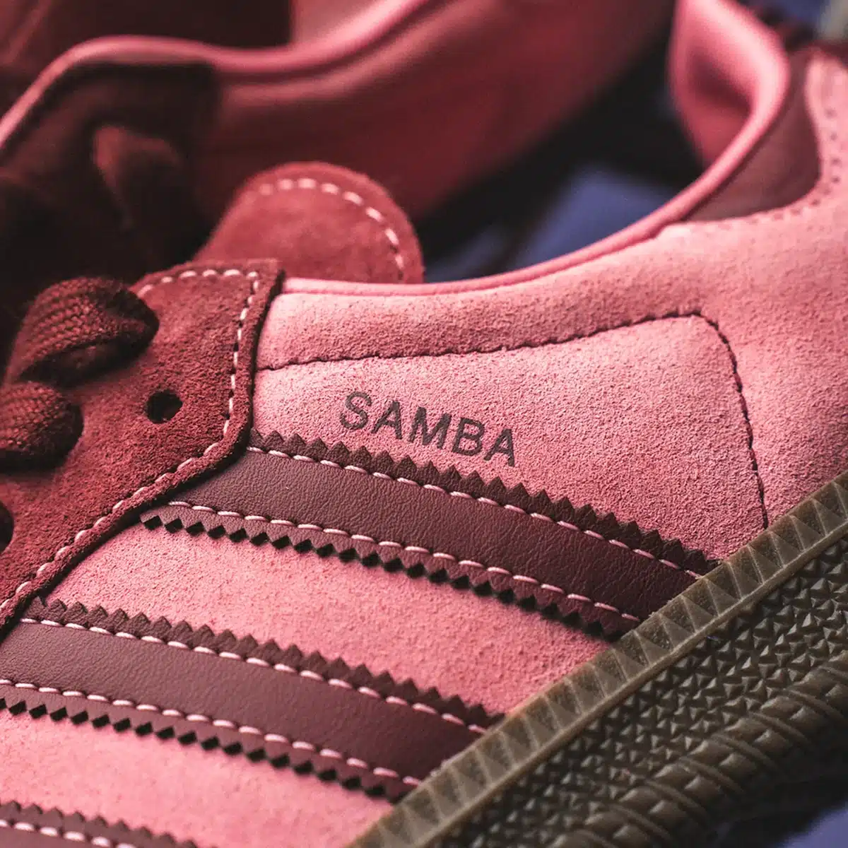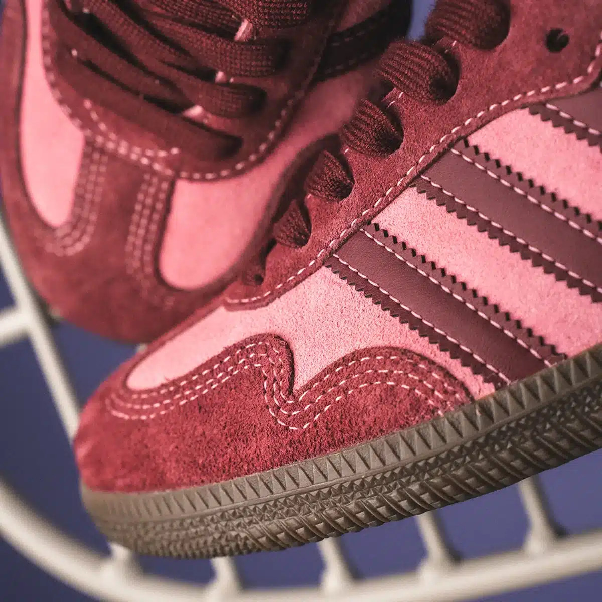 Côté matières, adidas a clairement bossé. Base en daim rose poudré, doux, presque velours. Les trois bandes, la languette, les œillets et le renfort avant passent en bordeaux, entre cuir et daim. Tu obtiens un contraste de textures puissant. Là où une Samba classique joue la carte du minimalisme plat, celle-ci apporte du relief, du grain, presque de la profondeur.