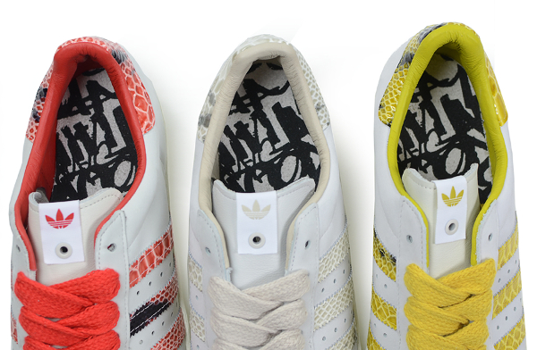Un imprimé serpent recouvre les 3 bandes. Les paires disposent également d’une partie supérieure en nubuck. Bien qu’annoncées pour le 8 juin dans les boutiques possédant un compte consortium, les Adidas Superstar (130/140 euros) sont déjà disponibles chez Colette.