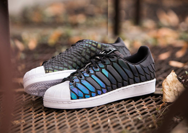 Une Adidas Superstar avec un imprimé de peau de serpent peut-elle être encore nous surprendre ? Vu le nom de Superstar exploitant le motif reptilien, on serait tenté de répondre négativement à la question. Le pack Xeno change la donne (à voir aussi Adidas ZX Flux Xeno). La marque aux trois bandes offre une nouvelle vie à l’imprimé. L’empeigne de la Adidas Superstar Xeno est conçue avec un matériau irisé. Les écailles brillent de plusieurs couleurs en cas de faible luminosité ou sous l’effet d’un flash. Une caractéristique qui n’est pas sans nous rappeler la peau luisante du Xenopeltis, le serpent qui à inspiré la collection.