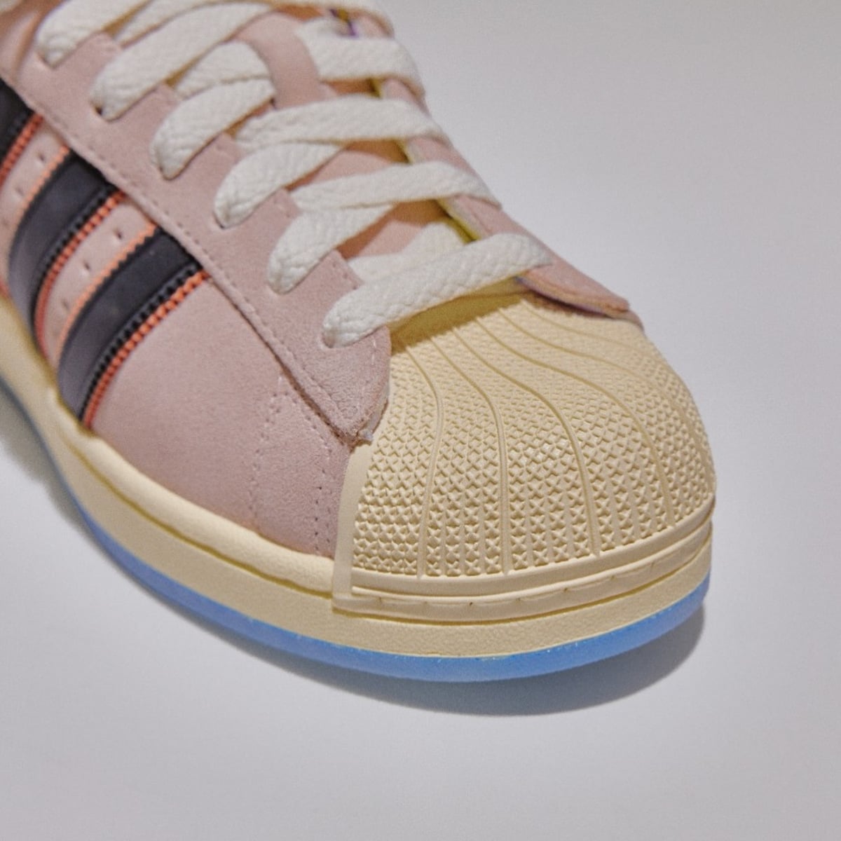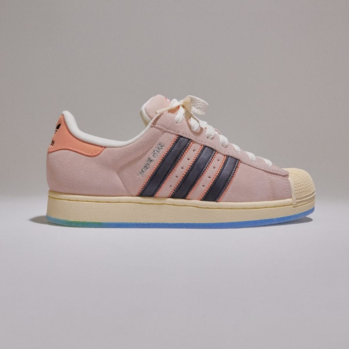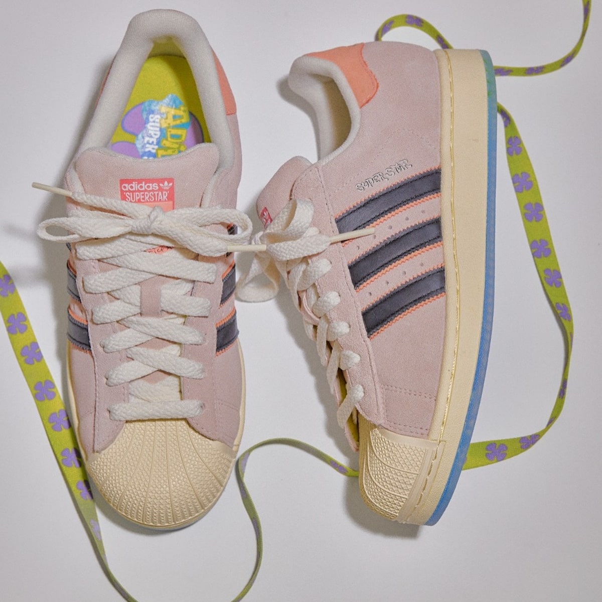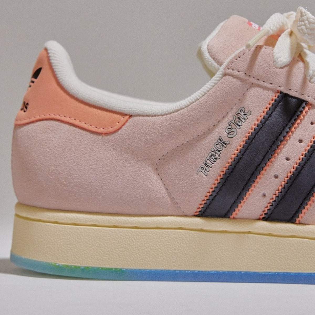 Le daim rose poudré recouvre tout la partie supérieure. Oubliez le rose bonbon qui fait mal aux yeux. Ici, c’est sobre et premium. Les 3 Stripes noires créent le contraste parfait. La shell-toe garde sa teinte crème classique mais avec des étoiles embossées en bonus. Patrick sourit depuis la languette. Impossible de le rater. Les lacets alternatifs reprennent son short fleuri. Vert et violet, motif reconnaissable entre mille.