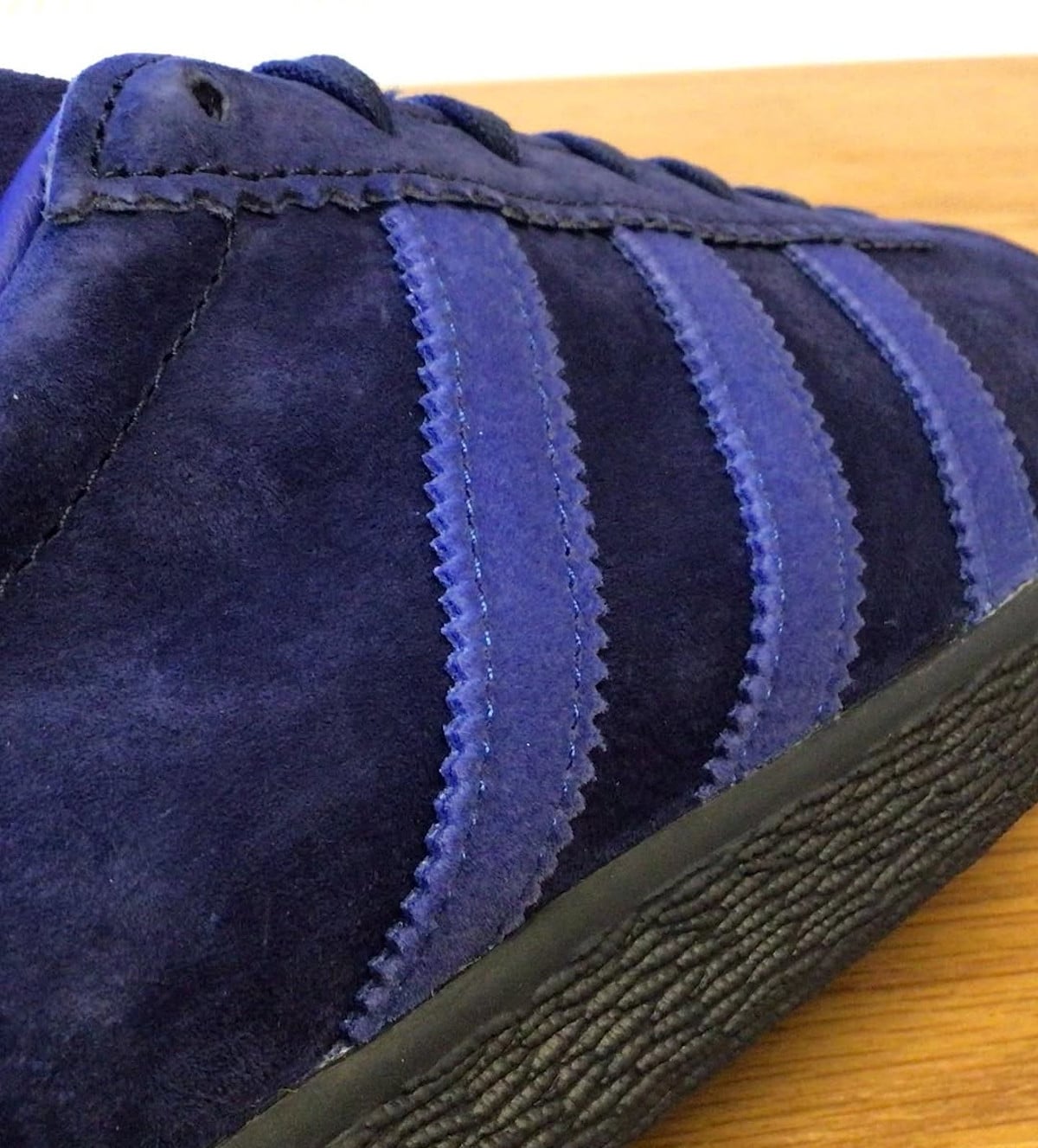 La version Night Sky pousse le monochrome dans ses retranchements. Daim bleu foncé voire violet sur l’empeigne, bien sûr. Mais aussi sur les trois bandes floquées, la languette, le talon. Même la semelle joue le jeu avec sa teinte navy. Seuls quelques détails Bold Blue viennent égayer l’ensemble. On est loin des éditions Jamaica ou Trinidad. Ici, on joue la carte de la retenue britannique. Il en découle une paire casual qui passe partout.