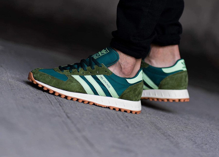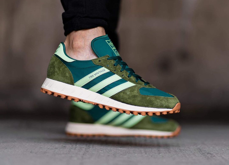 Début 2021, la TRX Runner s’est rappelée à notre bon souvenir. Autrefois une chaussure de marathonien, elle change de voie pour s’orienter vers un usage lifestyle. De nouveaux colorways sont disponibles. La Adidas TRX Vintage Green Olive Gum en jette grâce à sa palette de vert. Des tons sombres et clairs alternent sur son empeigne constituée de suède et de nylon. L’ensemble repose sur une semelle crantée en caoutchouc marron. L’été n’est pas la meilleure saison pour porter la TRX Vintage. En automne, la basket rétro produira pleinement son effet. En vente au prix de 100€ chez Size? France : voir la paire et BSTN : voir la paire.