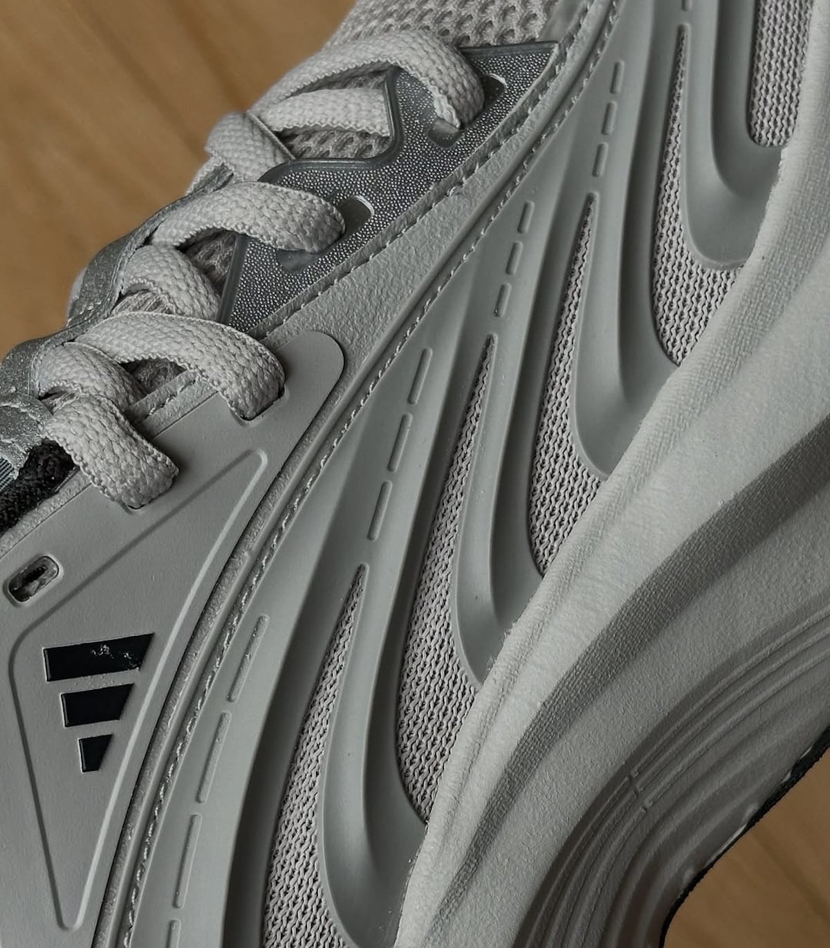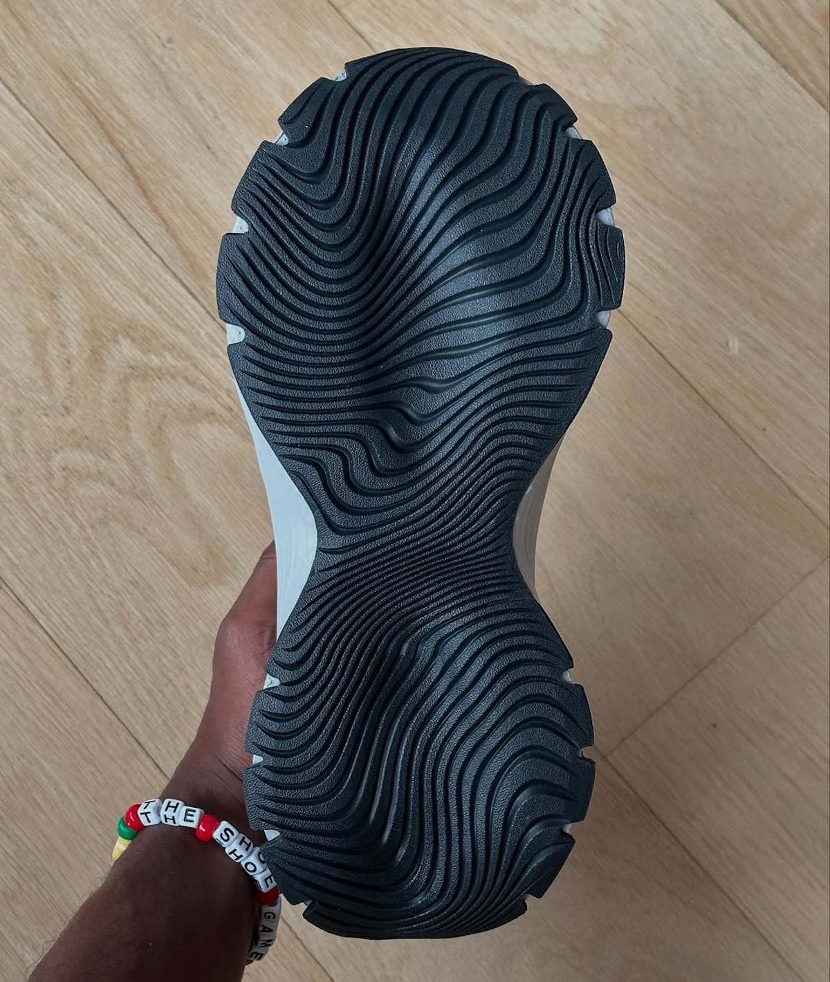 Quand vous ouvrez la boîte, deux réactions possibles : « C’est exactement ce que je voulais ! » ou « MAIS QU’EST-CE QUE C’EST QUE CE TRUC ? » Pas de juste milieu. La tige joue avec trois types de mesh différents : tissu aéré sur l’avant, maillage dense sur les côtés, texture rugueuse vers le talon. Les empiècements en cuir synthétique structurent l’ensemble. Sur les flancs, les trois bandes mythiques disparaissent, remplacées par cinq lignes caoutchoutées qui rappellent vieilles Predator de foot. Personne n’avait demandé ce crossover, mais maintenant qu’il est là, ça fonctionne.