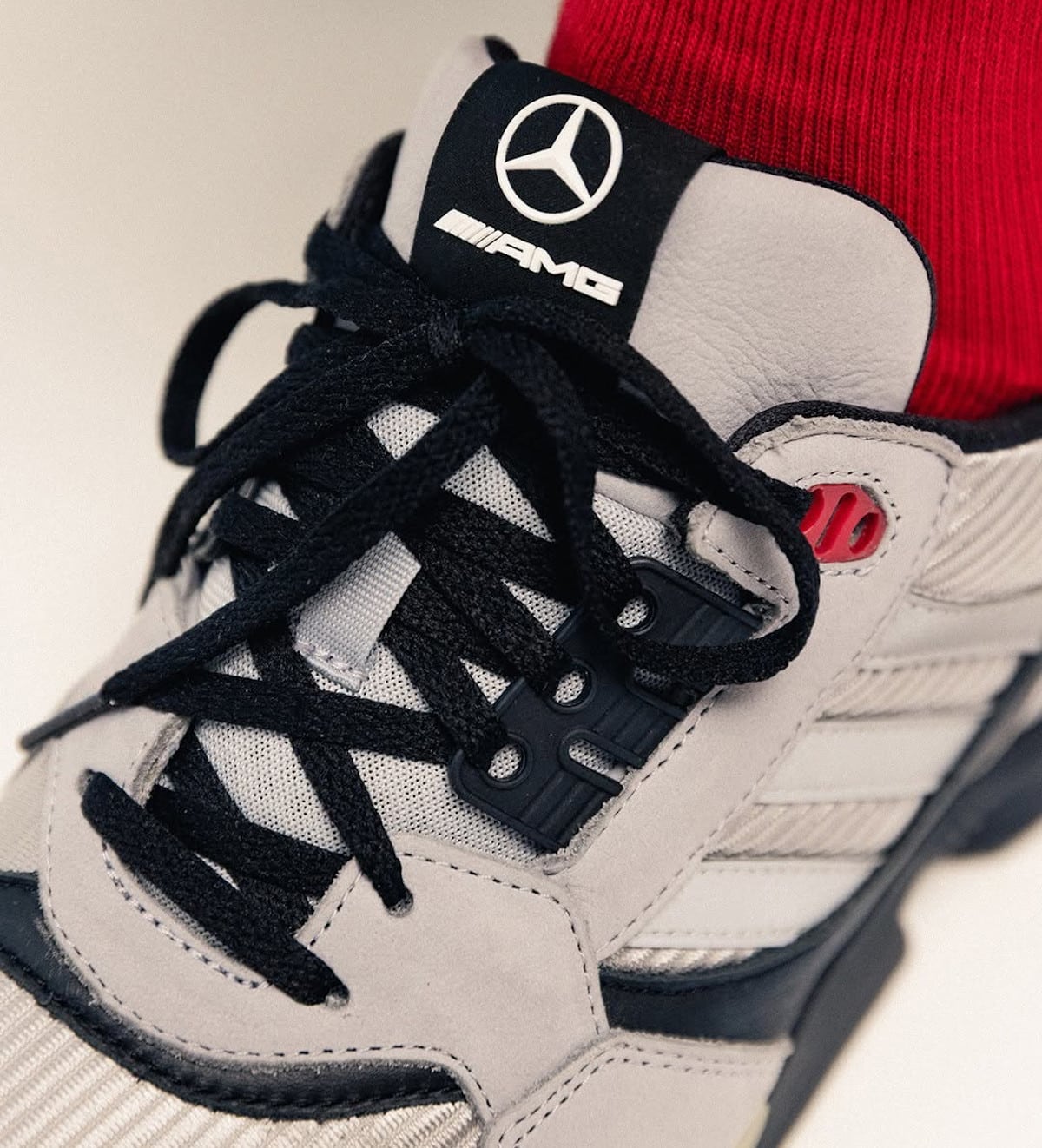 Overkill, cette boutique berlinoise qui ne fait jamais les choses à moitié, décide en 2021 de bricoler un nouveau modèle pour la série A-ZX d’adidas. L’idée ? Prendre le ZX 8000, lui coller des bouts du ZX 9000, et voir ce que ça donne. Cette fusion accouche de la adidas ZX 8500 qui aurait pu sortir du bureau de Jacques Chassaing. Une hybride bancale sur le papier, brillante dans la réalité. Sauf que voilà, après cette sortie graffiti délirante, plus rien. Le silence radio pendant quatre ans. Et puis Mercedes-AMG arrive. Vous savez, ceux qui fabriquent des voitures que la plupart d’entre nous ne pourront jamais s’offrir ? Eh bien ils ont décidé de s’intéresser aux baskets.