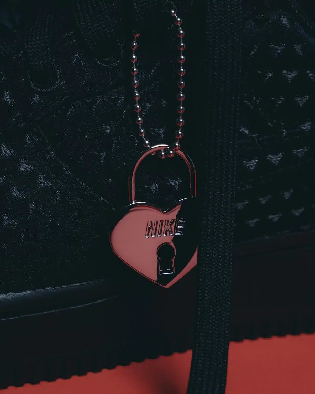 La paire en question, c’est une Air Force 1 en textile, recouverte de mini-cœurs. Tu ne verras aucun logo amoureux qui te donne l’impression d’entendre cette voix qui te dit : “regarde comme je suis romantique”. Juste ce qu’il faut. Et surtout, ce petit pendentif argenté en forme de cœur avec un trou de serrure qui fait penser à un cadenas. Tu le laisses ou l’enlèves si t’as pas envie de te balader avec un symbole sentimental au bout des lacets. J’aime beaucoup l’idée.