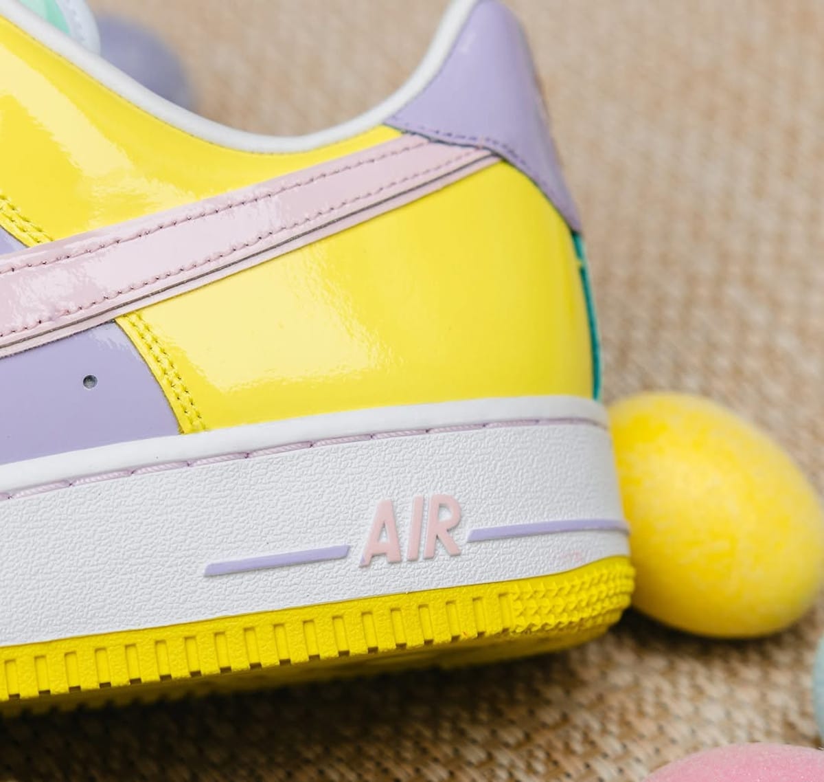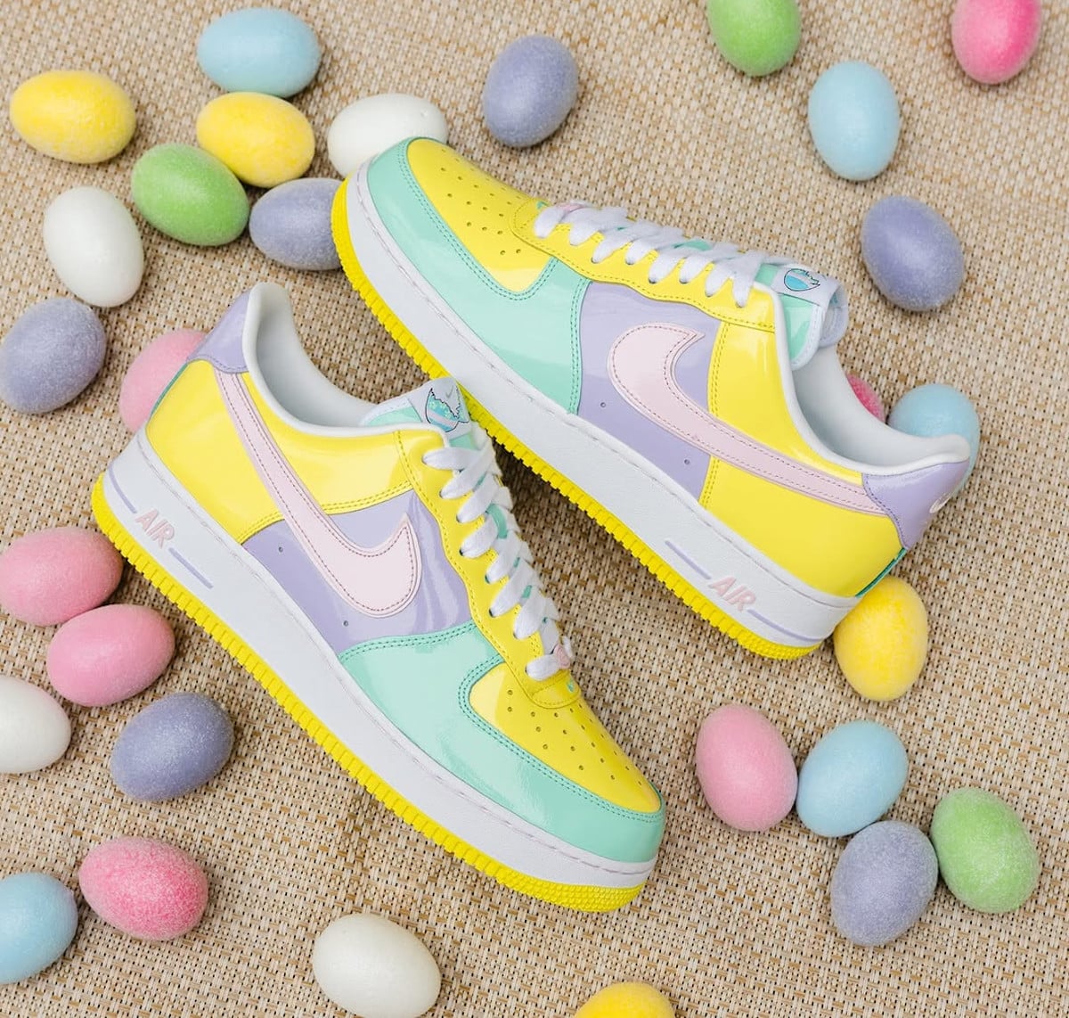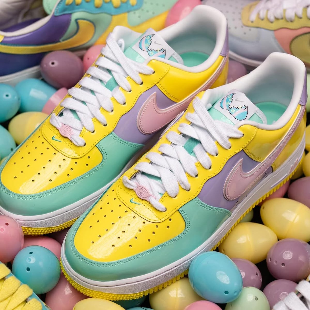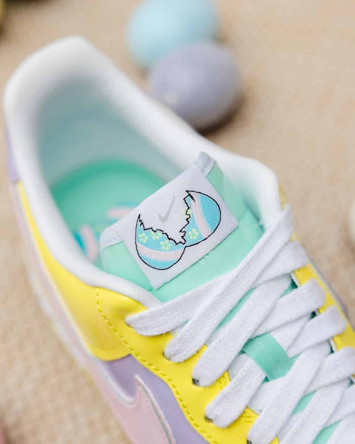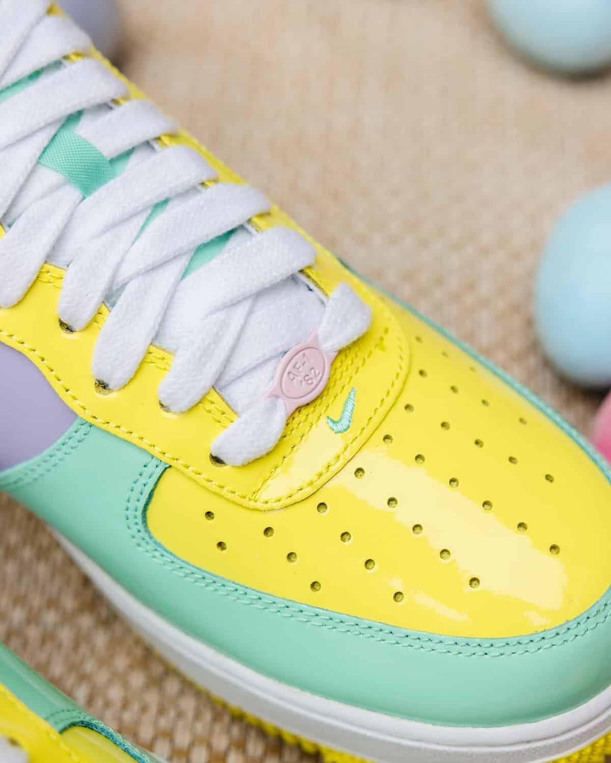 Revenons à la source. Le patent leather, c’est ce cuir brillant qui fait briller tes Air Force 1 comme un capot de voiture neuve. La AF1 Easter originale sort en 2005, et c’est un ovni. Nike l’habille dans un matériau presque laqué, qui capte la lumière comme un miroir avec des couleurs pastel super douces : lilas, jaune pâle, rose chewing-gum, bleu ciel. Le tout couronné d’un logo œuf fissuré sur la languette. Un détail immédiatement reconnaissable pour qui s’y connaît. Nike prenait un risque réel sur une silhouette déjà iconique tant cela était novateur.