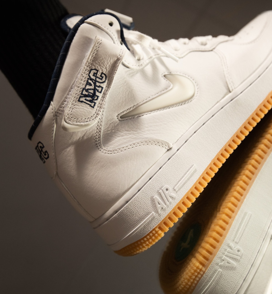 Nike a mis au point un pack d’Air Force One qui rend hommage à New York City. Tout le monde ne parle que de la Cool Grey. Son look d’AF1 du début des années 2000 plaide en sa faveur. Pourtant, il n’y a pas une énorme différence de niveau entre elle et la Nike Air Force 1 Mid Jewel Swoosh NYC ‘White Midnight Navy’. La basket blanche est aussi digne d’intérêt. Son imprimé pinstripe est un joli clin d’oeil aux Yankees, l’équipe de baseball basée dans le Bronx. Les chiffres à l’intérieur d’un cercle vert sous sa semelle en caoutchouc renvoient à des lignes de métro (4 & 5 Lexington Avenue Express & 6 Lexington Avenue Local).