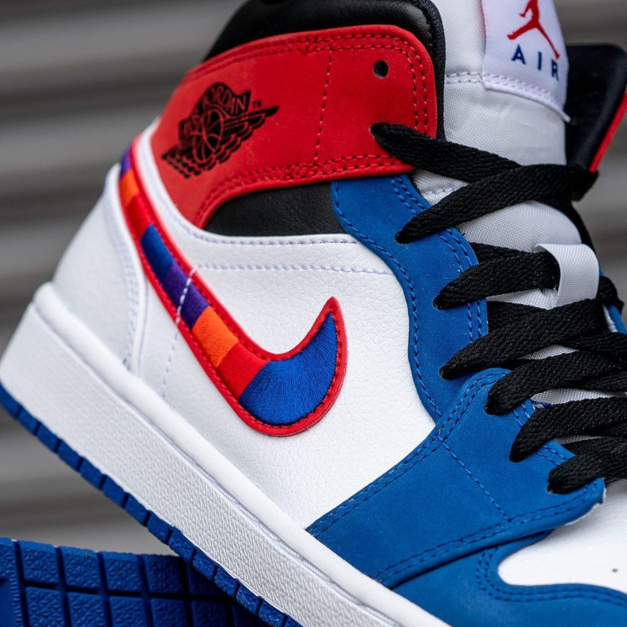 Compte tenu d’un faible stock, tout le monde n’a pas pu avoir sa Blue The Great x Air Jordan 1 Mid. La marque au jumpman se rattrape d’une certaine façon en dégainant une autre basket arc-en-ciel, la Air Jordan 1 Mid SE Multicolor Swoosh. Des récentes baskets mi-montantes sur lesquels un logo Wings est imprimé (Noble Red, Royal Blue, Satin Toe), cette édition spéciale est la plus captivante. L’idée du Swoosh multicolore brodé semble reprise à la AJ1 A Star is Born, un colorway de 2018 s’inspirant d’une couverture de Sport Illustrated. Quant à la partie avant blanche et bleue, elle évoque la Union comme l’un d’entre-vous me l’a signalé. Le modèle disponible en taille homme (prix : 120€) et enfant (90€) est en vente au Nike Store.fr : voir la paire.