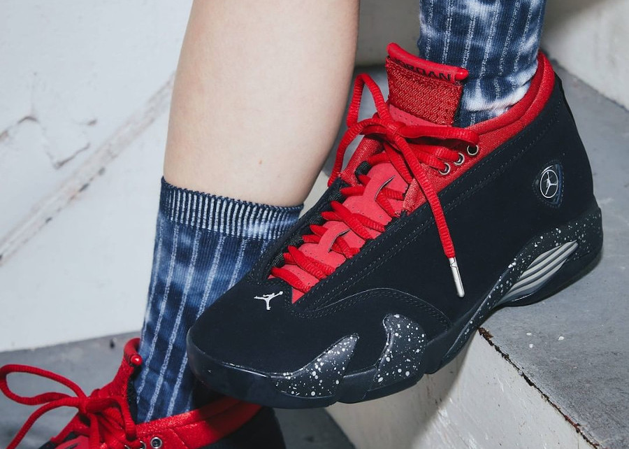 La marque au Jumpman veut que les femmes adoptent la Jordan XIV. Elle insiste bien que la Fortune de Aleali May ait rencontrée un succès mitigé. La prochaine joue à fond la carte de la séduction. La Air Jordan 14 Retro Wmns Iconic Red ‘Lipstick’ dispose d’une empeigne maquillée d’un luxueux daim noir. Des accents écarlates intensifient le contraste. Des petites taches agrémentent la midsole du modèle pour lequel Tinker Hatfield s’est s’inspiré d’une Ferrari. Son atout charme ? Les traces de rouge à lèvres sur la semelle intérieure qui forment un imprimé allover. En vente au prix de prix de 179.99€ (tailles femme) le jeudi 16 septembre au Nike Store.fr (à 9 heures) : voir la paire.