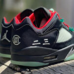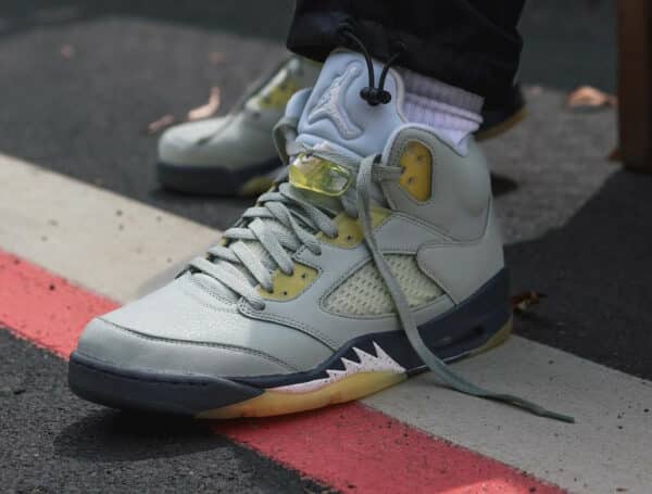 Une sneaker neuve qui à l’air usée ? Le nubuck de la Air Jordan 5 Retro Jade Horizon semble avoir subi l’effet de l’oxydation. Ce nouveau coloris du modèle qui s’inspire d’un aviation de combat dispose d’autres éléments vintage. Les œillets ainsi que la semelle sont jaunis. Ces détails sont typiques des baskets deadstock ayant bien vieillies. La AJ5 en daim vert jade n’a pas grand chose à voir avec la Racer Blue sortie le mois dernier. Son packaging s’avère attrayant. La boîte spéciale similaire à celle d’une Jordan 5 SE Apple Green Elevate constitue la cerise sur le gâteau.