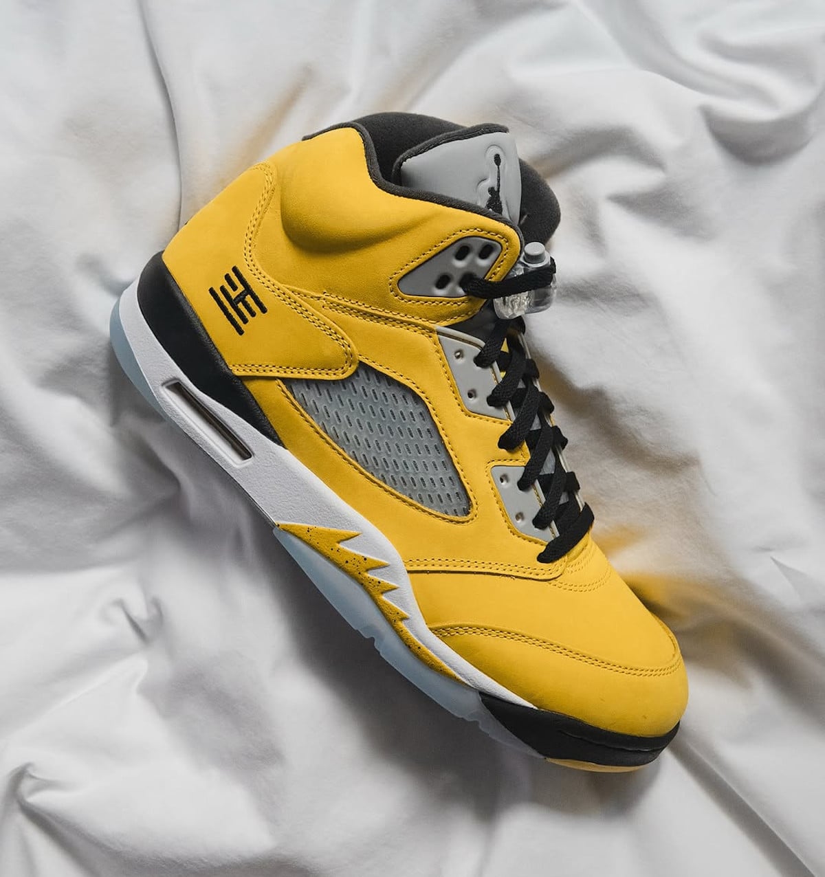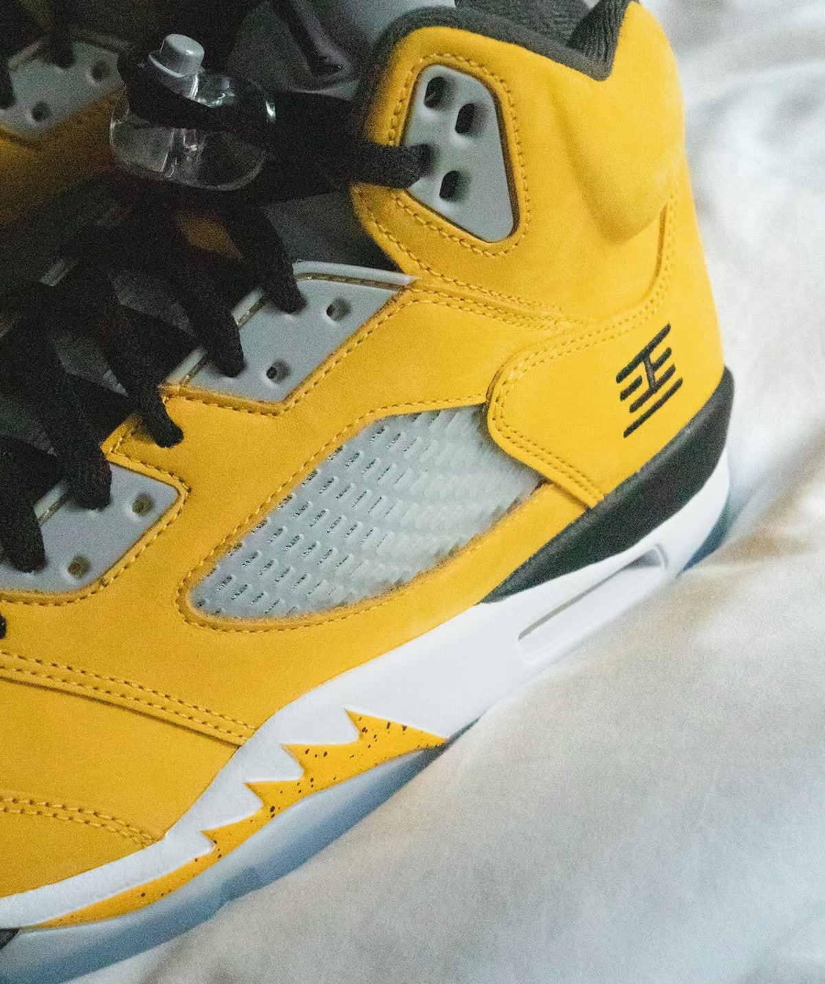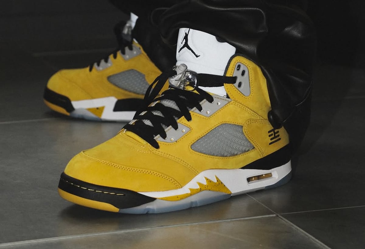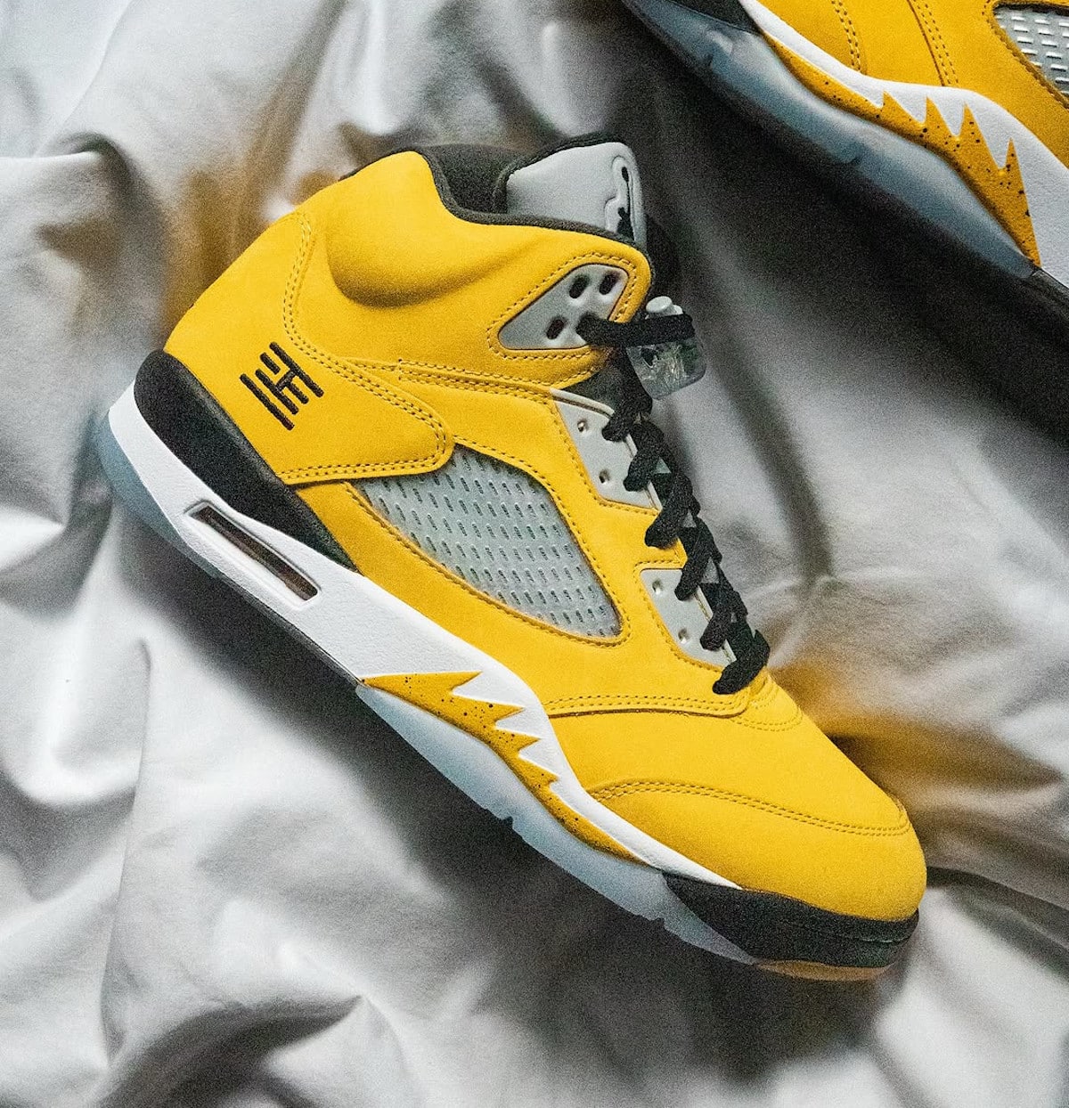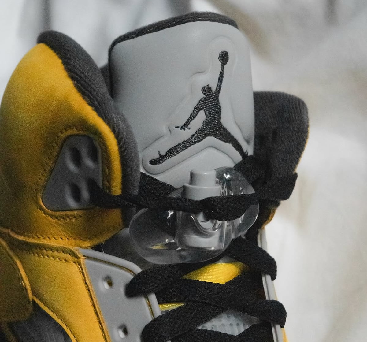 Retour en 2011. Jordan Brand ouvre sa plus grande boutique au Japon, dans le quartier branché de Shibuya à Tokyo. Pour marquer le coup, la marque sort une version unique de la Air Jordan 5. Entièrement jaune, avec cette broderie 23 en caractères japonais qui fait tout le sel de l’affaire.