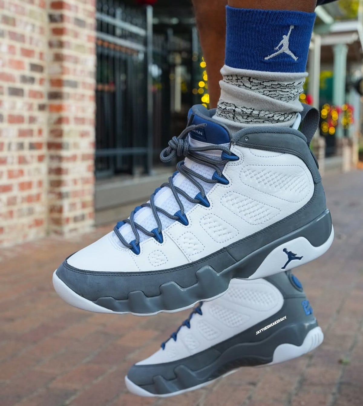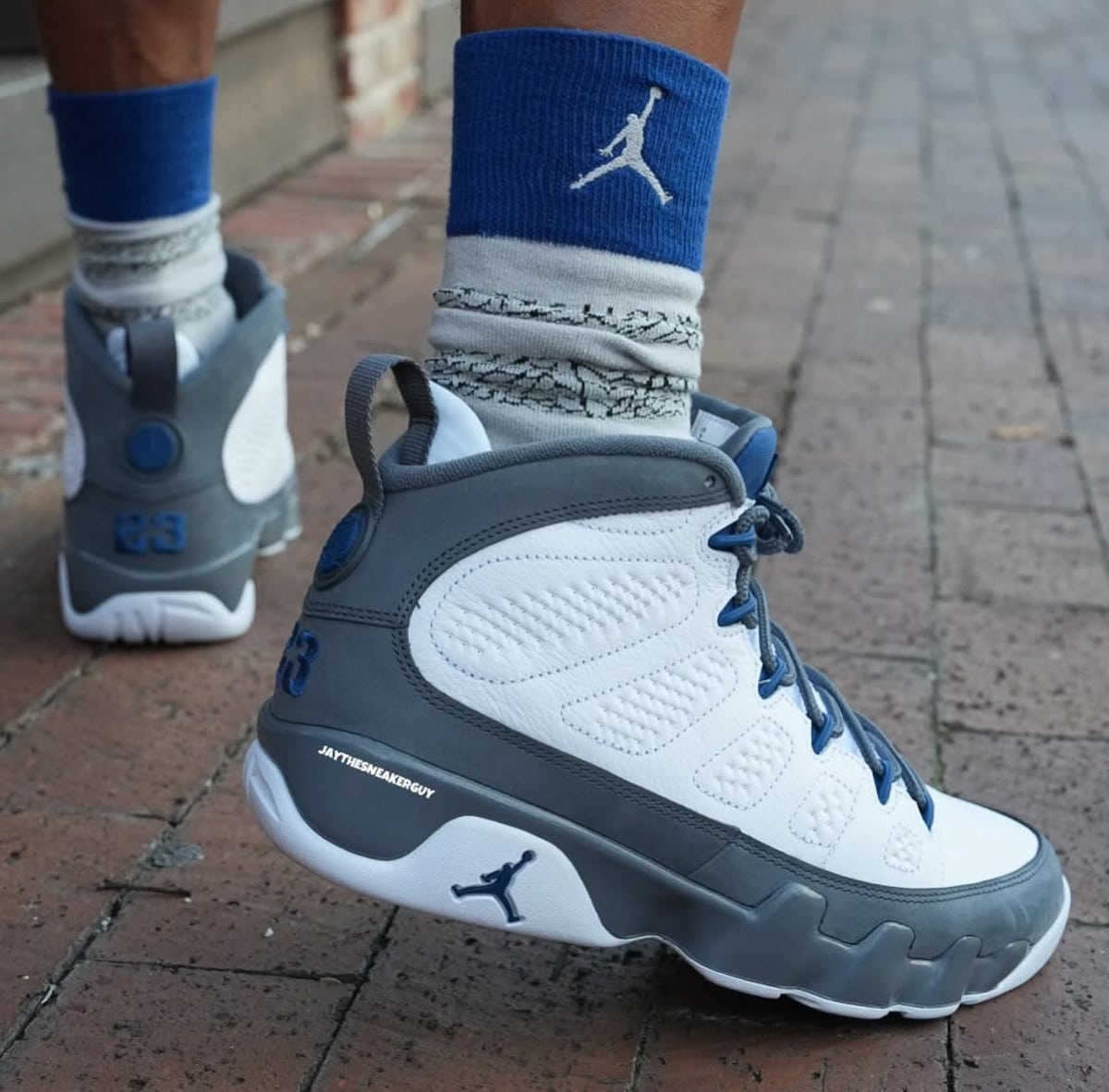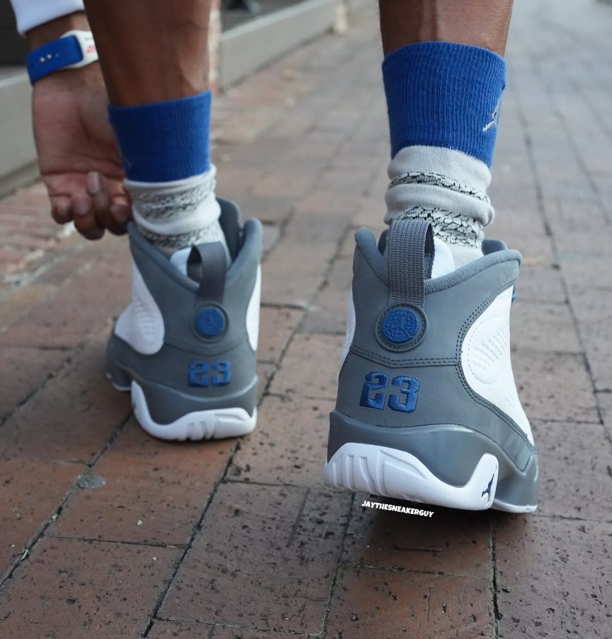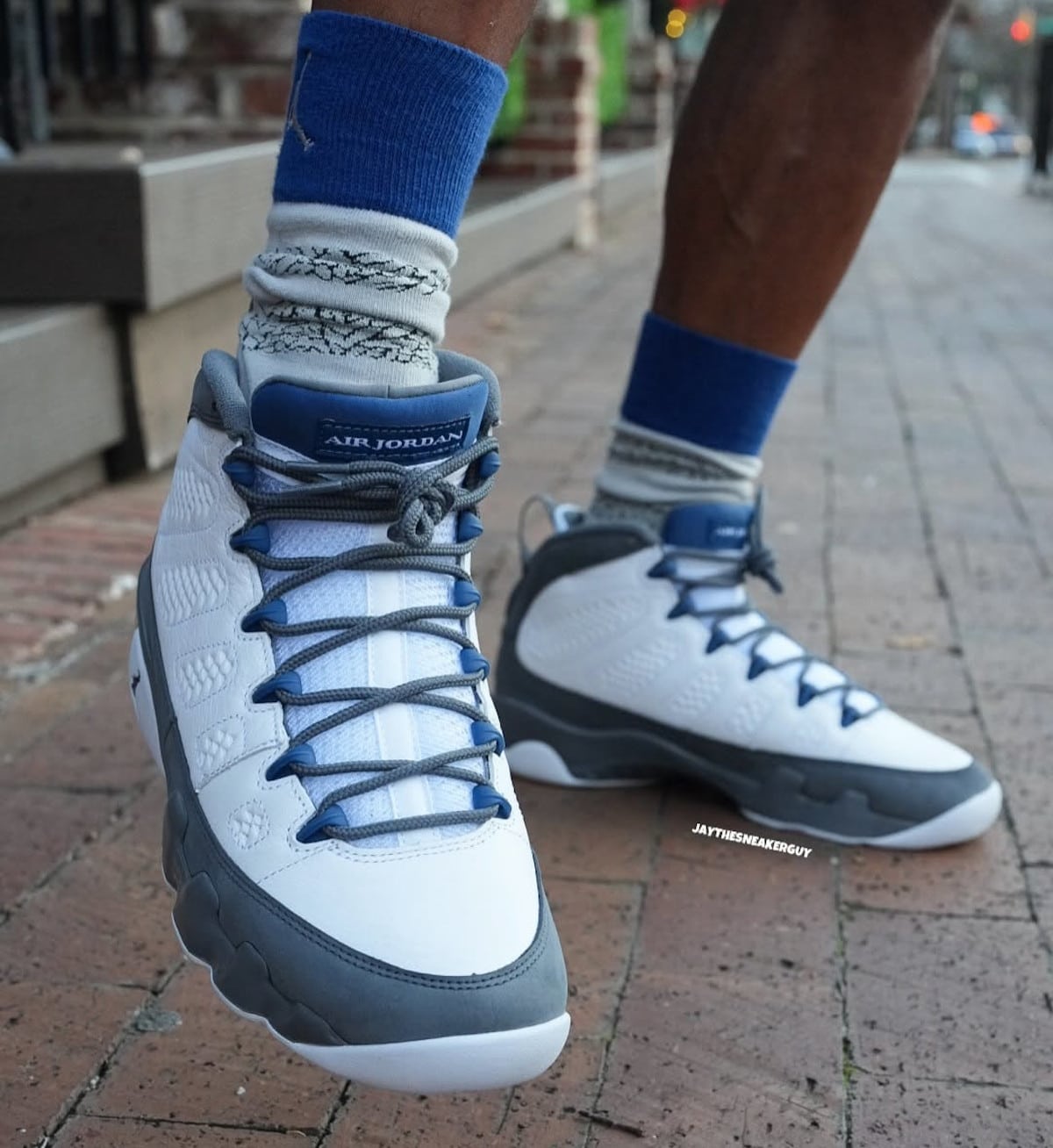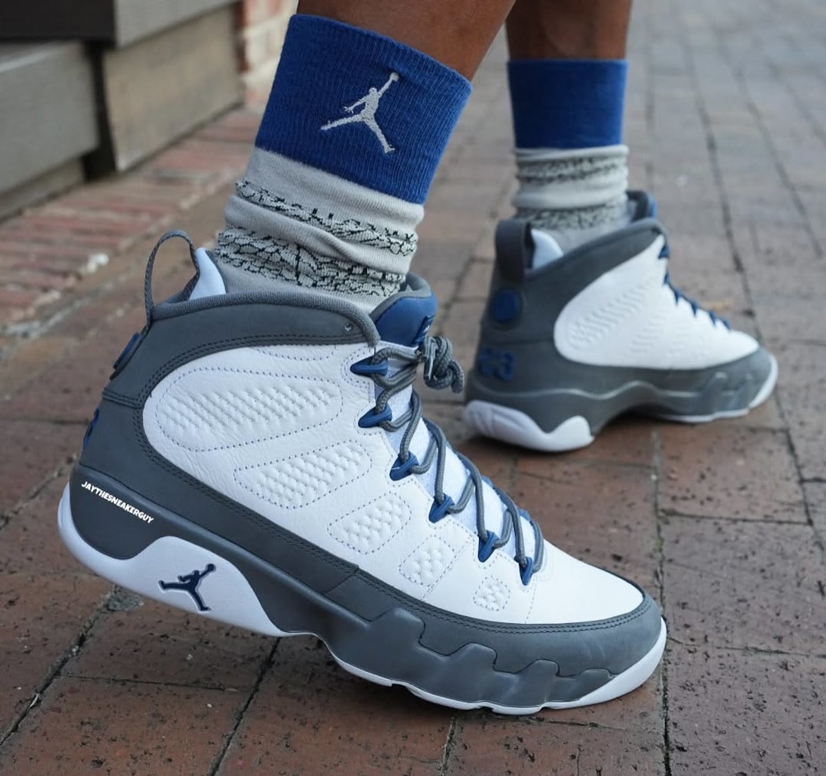 - La Flint Grey, c’est une Air Jordan 9 sortie originellement en 2002, un colorway blanc avec du nubuck gris ardoise sur le mudguard, des touches bleu sur les œillets et le Jumpman.
