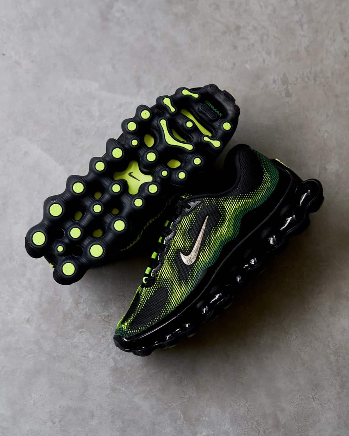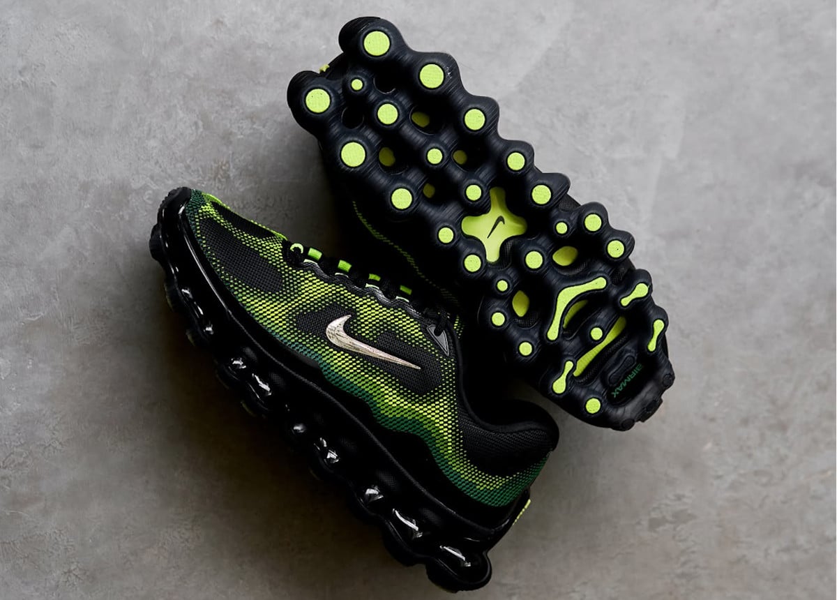 Hé, ce qui me bluffe vraiment dans la Liquid Max, c’est que l’inspiration ne s’arrête pas au coloris. Nike est allé beaucoup plus loin. Sur la tige d’abord. Les trois couches de nanoprint texturé reproduisent littéralement la peau de la grenouille. Les micro-dots dispersés imitent ses coussinets. Et le coloris Liquid Max Radiant Green Apple Green (celui qui sort pour le Air Max Day) joue exactement le même rôle que chez l’animal. Le lead color designer Mike McCoy le dit sans détour : la couleur, c’est la confiance, l’audace, c’est la protection. Pour une fois, le discours colle au produit. Je note.