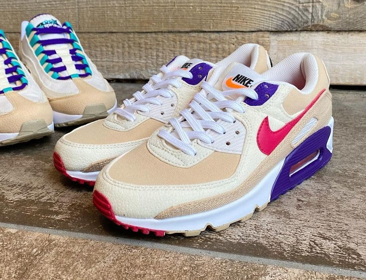 Ce printemps, on aura du mal à faire l’impasse sur la collection Air Sprung dont cette Nike Air Max 90 SE est issue. La Sesame épaule la Air Max 95 Coconut Milk et la AF1 ’07 Pink Oxford. Développée selon une approche zéro déchet, l’édition spéciale est conçue avec du grind. Le matériau recyclé s’est imposé au sein de la gamme Nike Lifestyle. La AM90 en toile beige et en cuir couleur crème se distingue aussi par son aspect jovial. Le champignon brodé sur la languette arrière et le papillon ornant la semelle intérieure, n’y sont pas étrangers. Le Swoosh rose et les pointes de violet aubergine laissent à croire que son designer s’est inspiré de la Air Max 3 OG Eggplant.