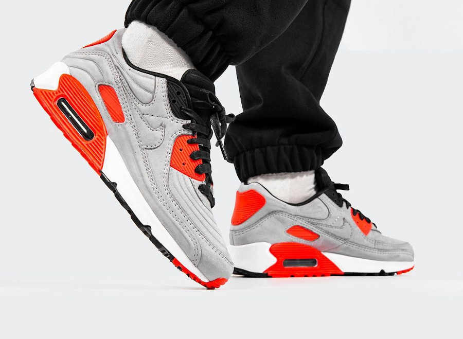 Dans le dossier sur les 1000 et une vies de la Air Max 90 OG Infrared, je réalise un tour d’horizon de toutes les variantes du modèle au cœur rouge. La liste s’est allongée en 2020 en raison du 30ème anniversaire. A la Reverse Duck Camo arrivée en mars, s’ajoute la Nike Air Max 90 Lux QS Bright Crimson Night Silver. Cette forme inédite associe les touches d’Infrared à un tissu matelassé gris. Le rendu en relief est assez similaire à celui d’une AM90 Ultra SE, une itération disposant d’une empeigne en mousse. Le matelassage produit un agréable effet vague. Les ondulations se répandent à l’arrière, sur le garde boue et la toe box sans oublier la languette. L’édition limitée est disponible au prix de 160€ au Nike Store.fr : voir la paire et chez Size? France : voir la paire.