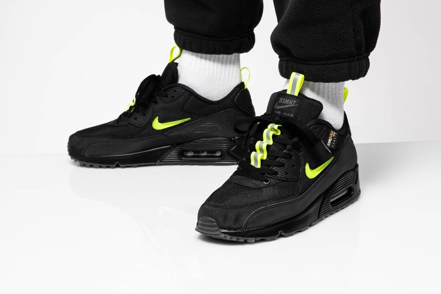 La deuxième Air Max 90 du pack City nous conduit à Manchester. The Basement a tout prévu si vous souhaitez ne pas subir les aléas climatiques fréquents dans cette ville pluvieuse du nord-ouest de l’Angleterre. Non seulement la AM90 Black Lemon Venom intègre du Cordura Fabrcis mais elle résiste également à l’eau. D’autres éléments tels que le pull tab et le Jewel Swoosh (une première pour la Nike 90) méritent d’être mentionnés. La devise « Real People Do Real Things » qui était sur la semelle intérieure de l’édition Glasgow, passe sur l’outsole, translucide en l’occurrence. L’ultime édition limitée, la London, sortira la semaine prochaine. Quant à la chaussure noire et fluo, elle est sortie (prix : 160€) de manière inopinée aujourd’hui au Nike Store.fr.