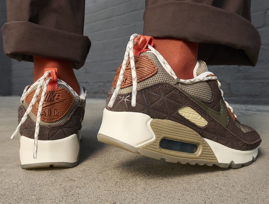 Une édition spéciale influencée par la Travis Scott x Air Max 1 ? C’est la première chose qui frappe lorsque l’on découvre la Nike Air Max 90 SE Baroque Brown Medium Olive. Le système de laçage reposant sur un stoppeur placé au talon (lace toggle) du modèle femme, est l’autre aspect marquant. Le design s’avère très solide, du suède premium marron orné de formes géométriques aux lacets de randonnée, en passant par le mini-Swoosh beige et la virgule en cuir vert kaki. La semelle transparente se fait oublier mais équilibre l’ensemble. Le style outdoor du coloris automnal plaira aux adeptes des Nike ACG.