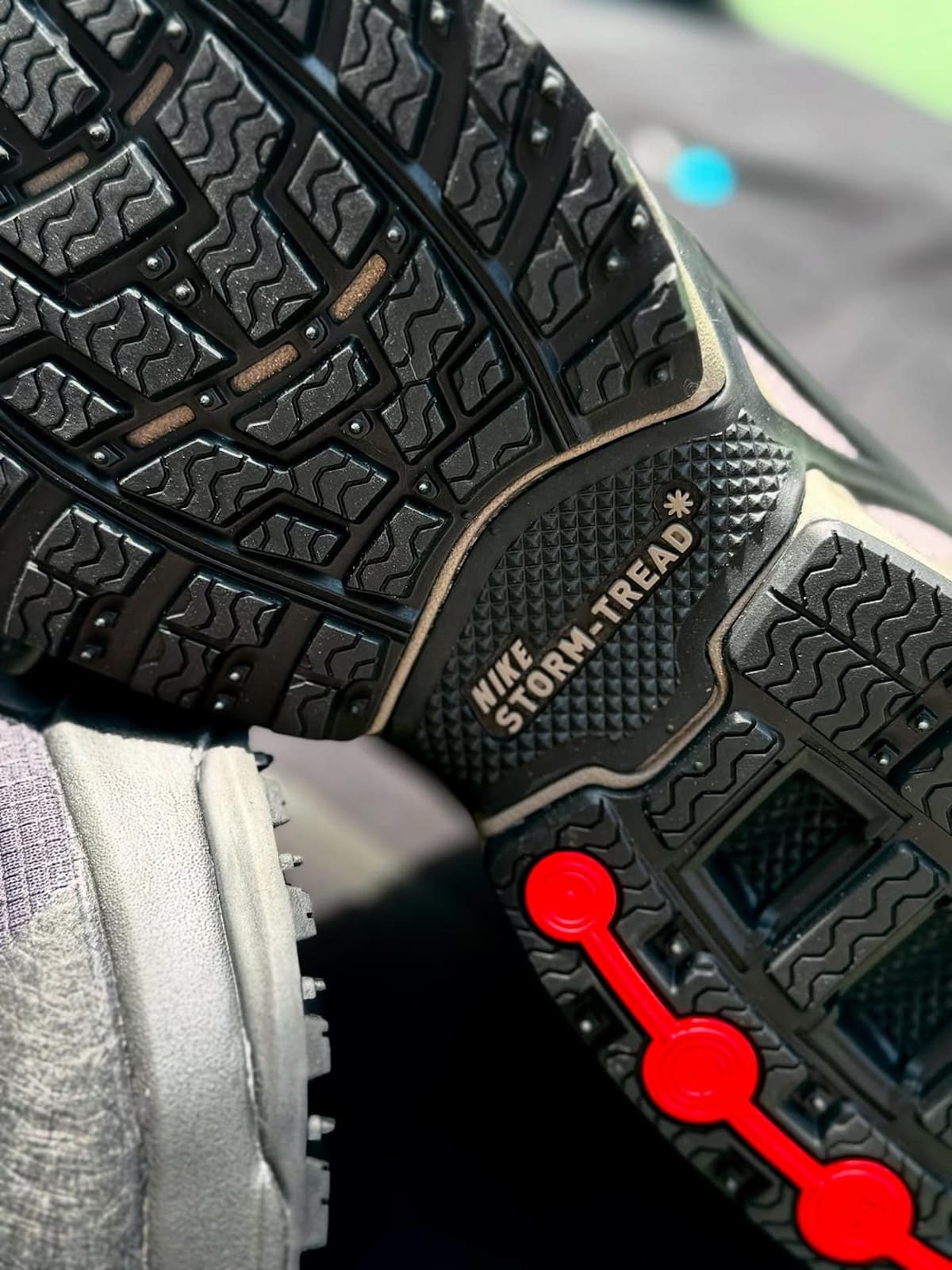 L’enveloppe déperlante fait son travail sérieusement. Elle ne laisse pas passer une goutte. Terminé les chaussettes trempées quand le ciel vous tombe dessus. Le mélange textile et cuir synthétique tient la route. Quelques touches de ripstop renforcent les zones sensibles. Le Swoosh sur la toe box, les détails métalliques argentés et réfléchissants réveillent l’ensemble.