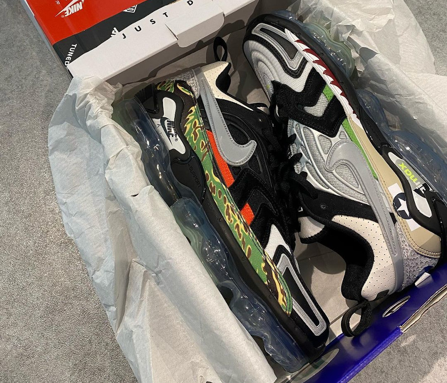 La Nike Air VaporMax EVO NRG Collector’s Closet ‘What The’ nous mène lentement mais sûrement vers le Air Max Day 2021. La nouvelle running hybride se veut ambitieuse. Sa partie supérieure réunit 7 modèles de la franchise à la bulle d’air. Certains sont facile à distinguer : Air Max 90, 93, Nike Air 180, Air Max Plus (la Requin). Pour les autres, il faut être un fin connaisseur : Air Max 96 II, Tuned 1999 et Solas. L’ensemble repose sur un coussin de Vapormax 2. Vous arrivez encore à me suivre ? Son premier coloris complexifie l’existant. La chaussure dépareillée est le fruit d’un mélange assez improbable d’éditions limitées. On identifie aisément l’imprimé dents de requin d’une AM90 Warhawk ou l’imprimé 3M reflective de la Moon Landing. La Supreme x Air Max 98 Sail Snakeskin lui prête son motif reptile. Une collaboration avec Atmos Tokyo est partie prenante, la Air Max 1 Tiger Camo Snake en l’occurrence. Le pony hair et le print Safari complètent sa panoplie animale. La NRG pique les logos des Air Max 95 et Nike TN. La Vapormax EVO Collector’s Wardrobe dispose d’une boîte patchwork mixant celles de précédents modèles. La sneaker est déconcertante. Garder de la cohérence avec autant d’éléments hétérogènes s’avère difficile. Son design brouillon lui attira beaucoup de détracteurs. En vente au prix de 224.99€ le jeudi 18 février au Nike Store.fr (à 9 heures) : voir la paire.