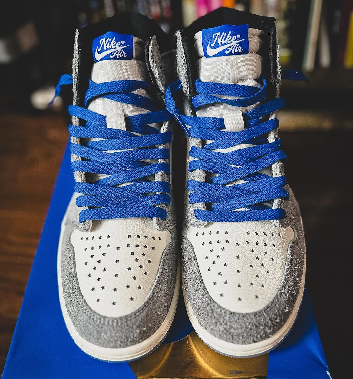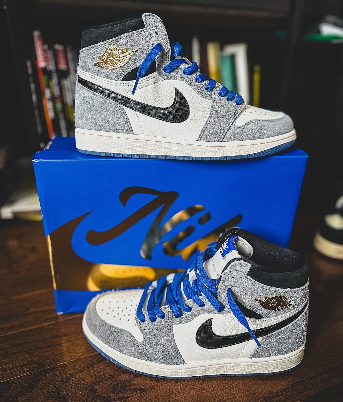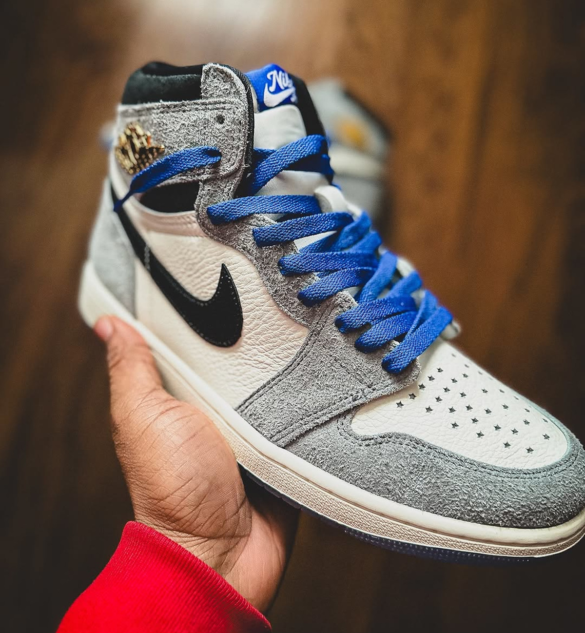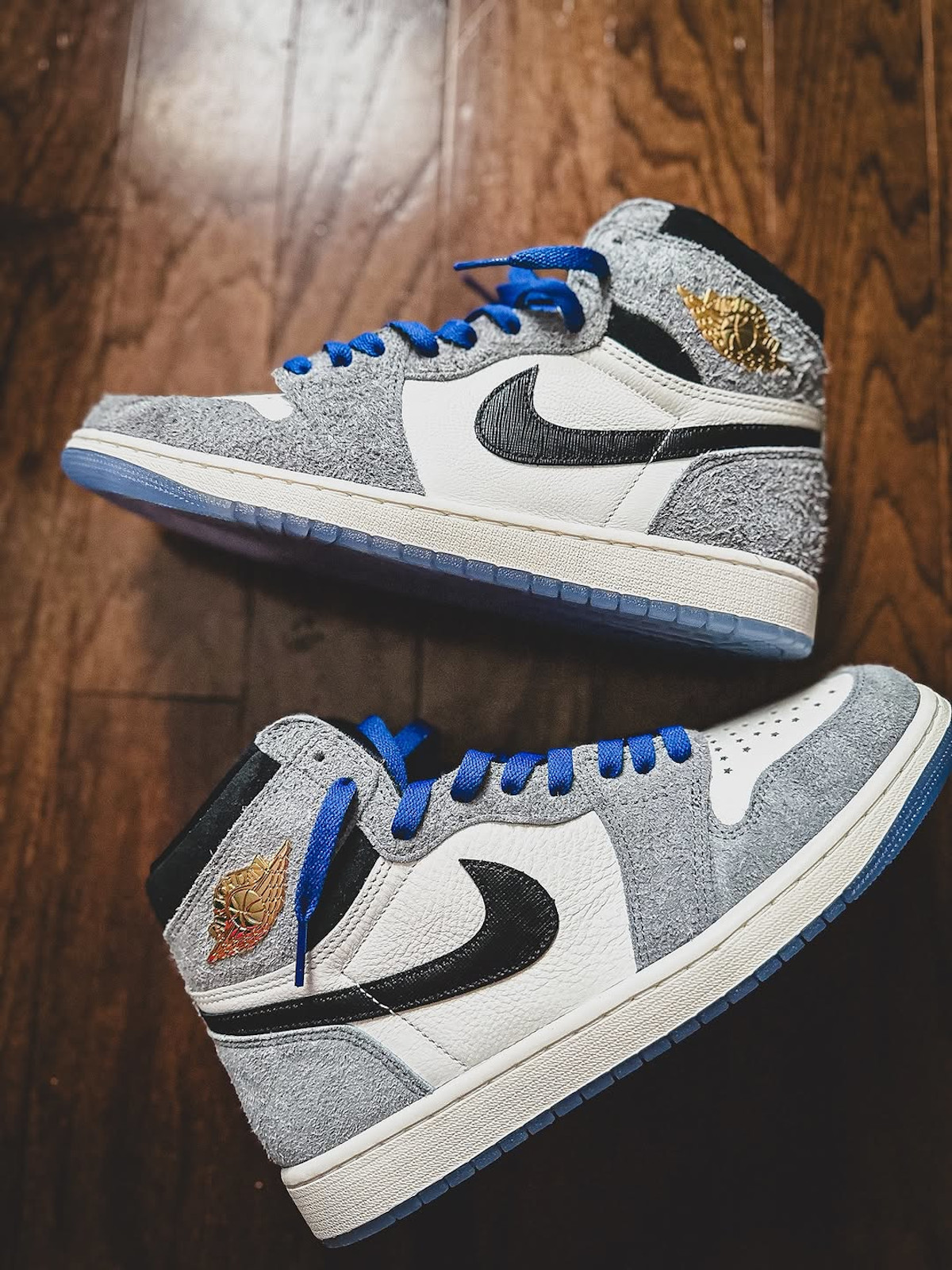 Tu te rappelles la AJ1 Chameleon de 2017 et ses reflets irisés ? Là, c’est l’opposé. Jordan freine des deux pieds et mise sur l’élégance. Le daim gris est doux comme un plaid en hiver, le cuir blanc est bien grainé, et les Wings dorés brillent sans faire sapin de Noël.