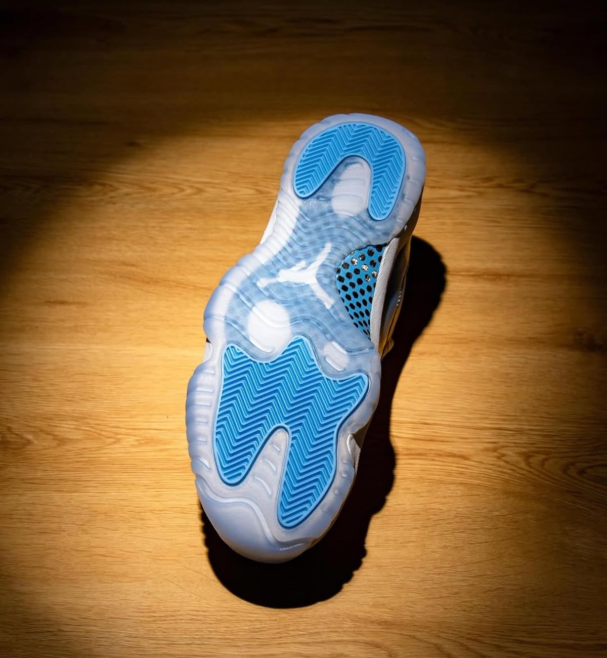 Le patent leather bleu ciel n’a rien perdu de son éclat. Le cuir brillant au printemps ou en été, ça déchire. La semelle semi-transparente complète le tableau avec brio. Le branding « Nike Air » sur la semelle intérieure à la place du Jumpman, c’est un clin d’œil au modèle original de 1996, un geste qui ravira les connaisseurs.