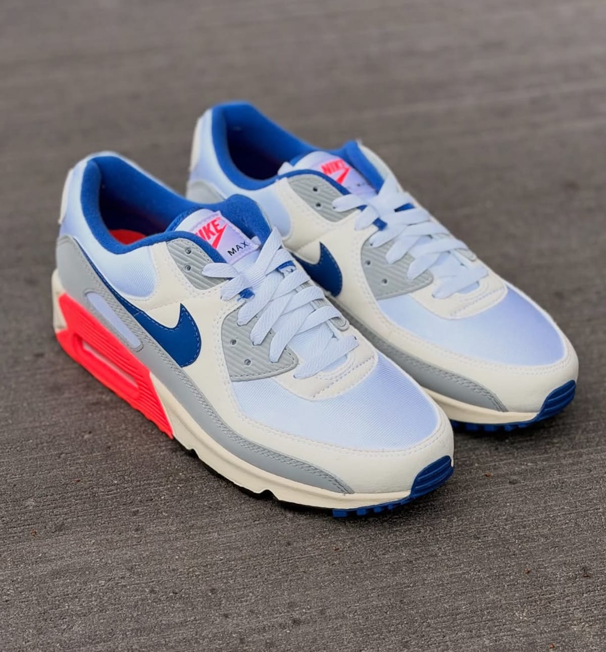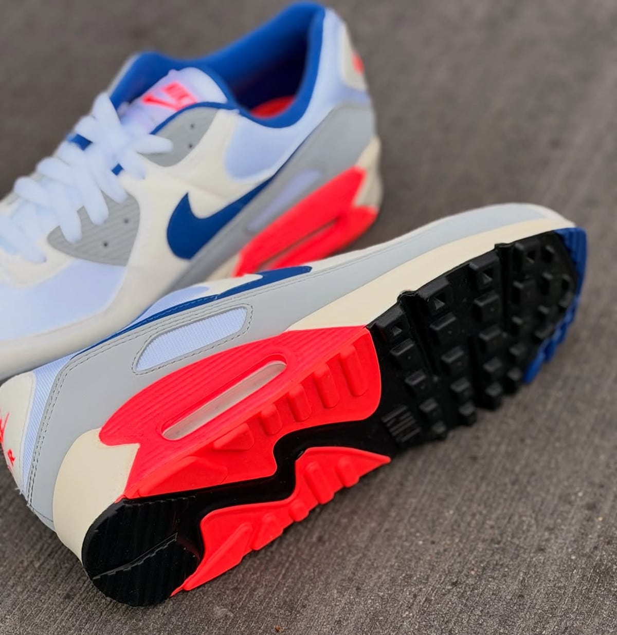 Bon, ça donne quoi cette Nike Air Max 90 Ultramarine (le nom officiel Air Max 90 Base Grey and Sport Royal, c’est vraiment pour prendre les gens pour des jambons) dont tout le monde parle ? Déjà avant d’aller plus loin, je vais te dire que c’est pas une première. En 2018, la marque au Swoosh a gratifié la communauté d’une Air Max 90 Essential aux couleurs du coloris le plus emblématique de la Nike Air 180 OG (et même une Air Max 95). Disons que l’interprétation était un peu plus libre (ses oeillets sont noirs et le mudguard est en cuir blanc). Son rouge solaire vire vers le rose fluo et le bleu-violet s’avère davantage foncé. Et puis t’as ce shape….. Ah comment dire, comment en parler sans devenir grossier : sa forme est affreuse. Je vais essayer d’être positif. Il a aidé la marque au Swoosh. Elle avait un exemple de tout ce qu’il ne fallait pas faire. D’ailleurs, par la suite tu as une la Air Max III Recrafted comme quoi Nike sait apprendre de ces erreurs. Je n’ai rien n’a dire concernant celui de la version de 2026. Dans l’ensemble, j’ai vraiment l’impression que les designers ont bossé à partir de la Air Max 180 Big Bubble Ultramarine. Les couleurs sont beaucoup plus conformes. J’ai aussi le sentiment que la Air Max 90 OG Concord a aussi servi de base de travail. Visualise le truc, les similitudes sont dingues. Parfois, les marques abusent avec le traitement jauni. Sur cette AM90 Ultramarine 2026, l’effet vintage glisse comme de la crème chantilly sur une tarte à la fraise.