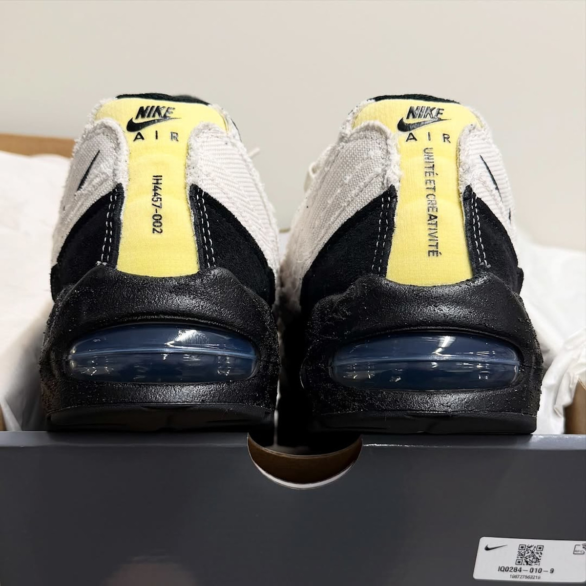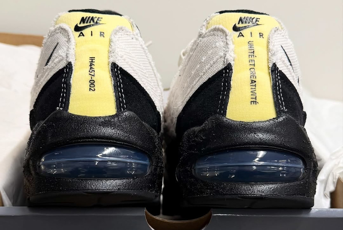 Le concept m’a scotché. Nike s’est plongé dans l’univers des ateliers créatifs parisiens pour accoucher d’une paire habillée de canvas, avec des bords volontairement effilochés comme un jeans que t’aurais oublié dans la machine. Les semelles intérieures imitent un plan d’architecte et portent l’inscription « Unité et Créativité« . Le truc ingénieux, c’est la toile qui en vieillissant transforme ta paire en pièce unique. Elle repose sur la fameuse grosse bulle, celle qui a redonné à la AM95 ses proportions d’origine après des années de coussins rabougris.