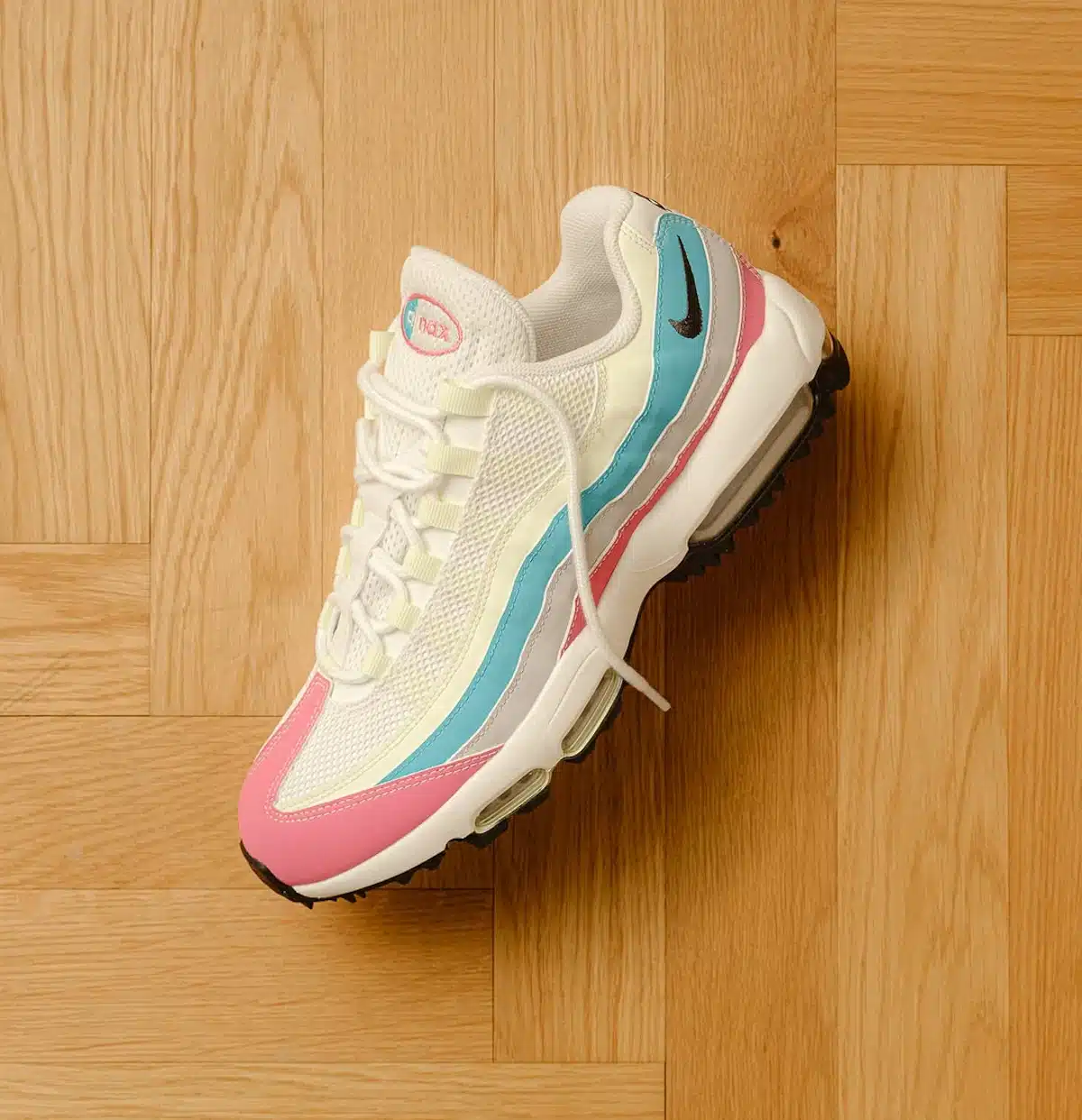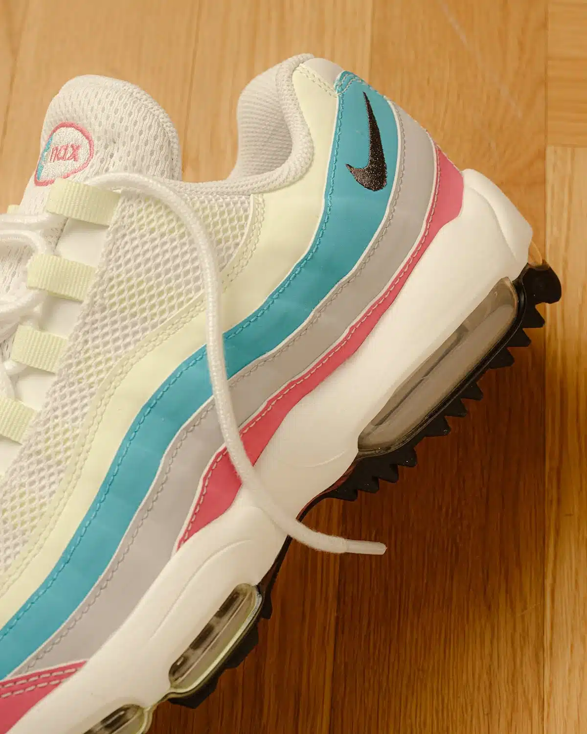 - La Nike Air Max 95 Golf Peony Dusty Cactus adapte l’iconique silhouette de 1995 pour le parcours avec une semelle spikeless et des unités Air optimisées.