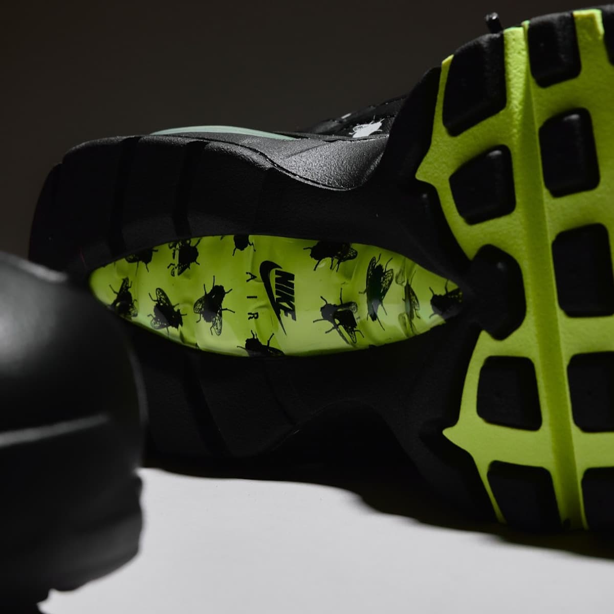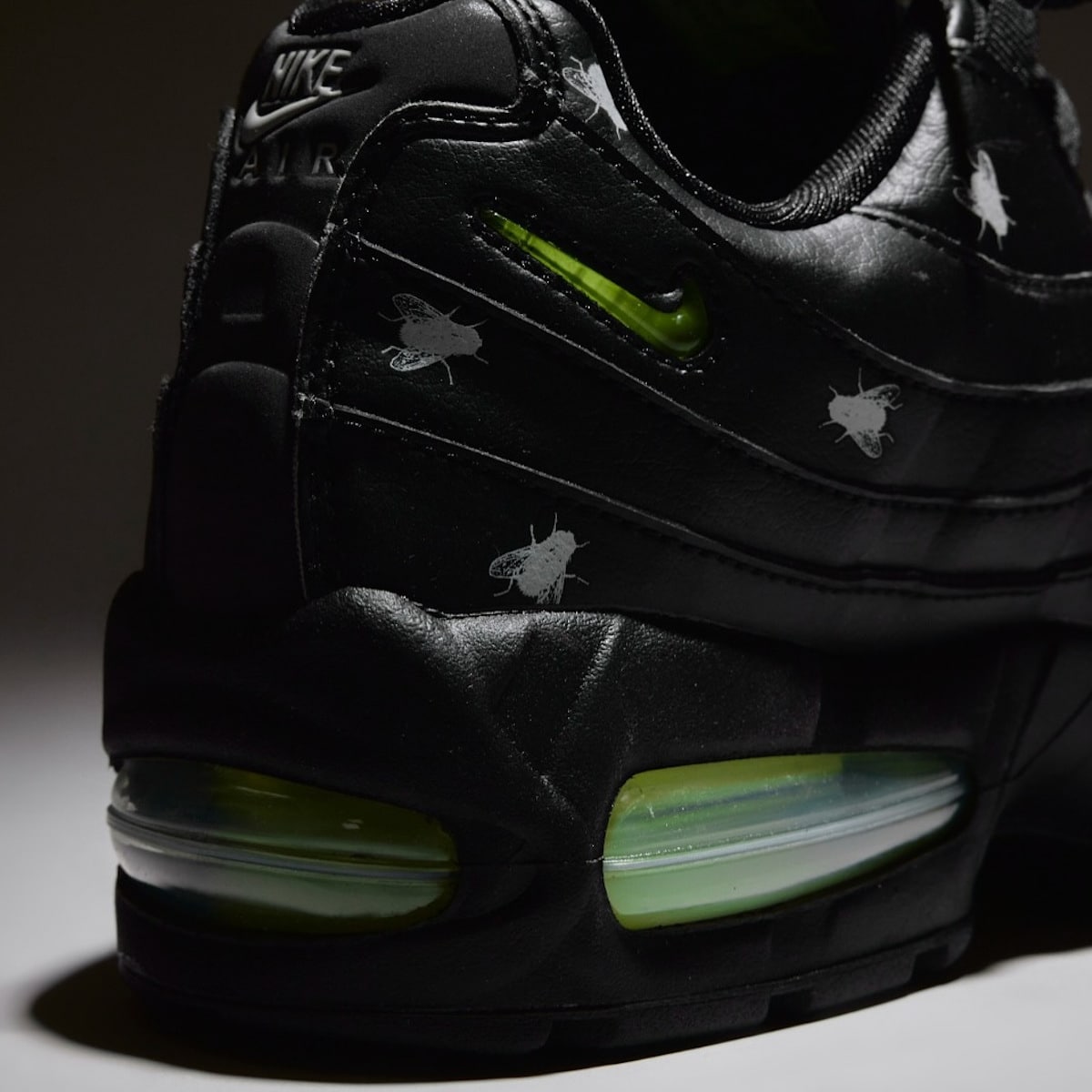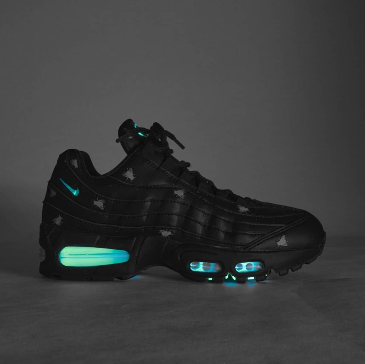 Cette AM95 Houseflies, elle joue la sécurité. Face à la Freddy Krueger qui vous filait des cauchemars rien qu’en la regardant, ou à la version avec un oeil brodé de 2014 qui reste une référence, celle-ci fait profil bas. Nike a mis les mouches, validé le coloris, et hop. Les détails lumineux sauvent tout. Cette petite virgule qui scintille. Ces bulles qui palpitent dans l’obscurité. Ce logo Air Max de languette phosphorescent. C’est suffisant pour éviter le naufrage.