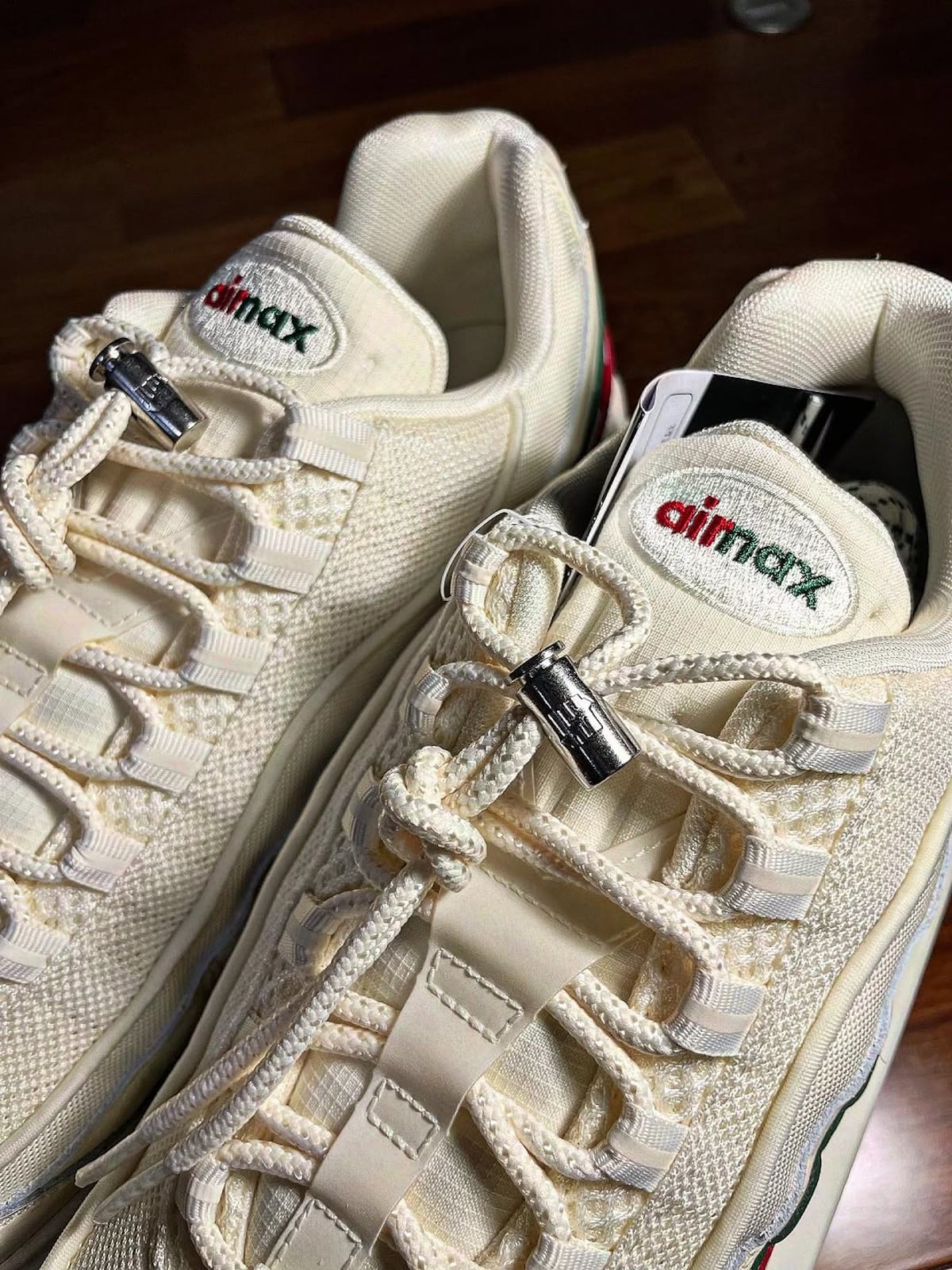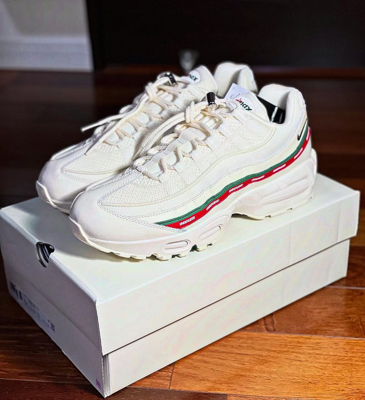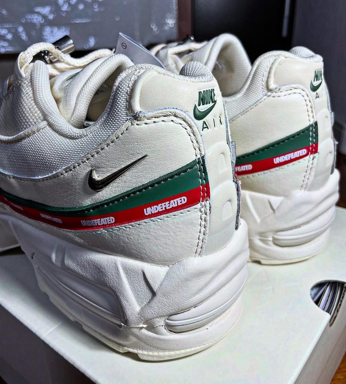 - La Nike Air Max 95 x Undefeated Sail White revisite la collaboration Air Max 97 de 2017 avec ses bandes vert et rouge.