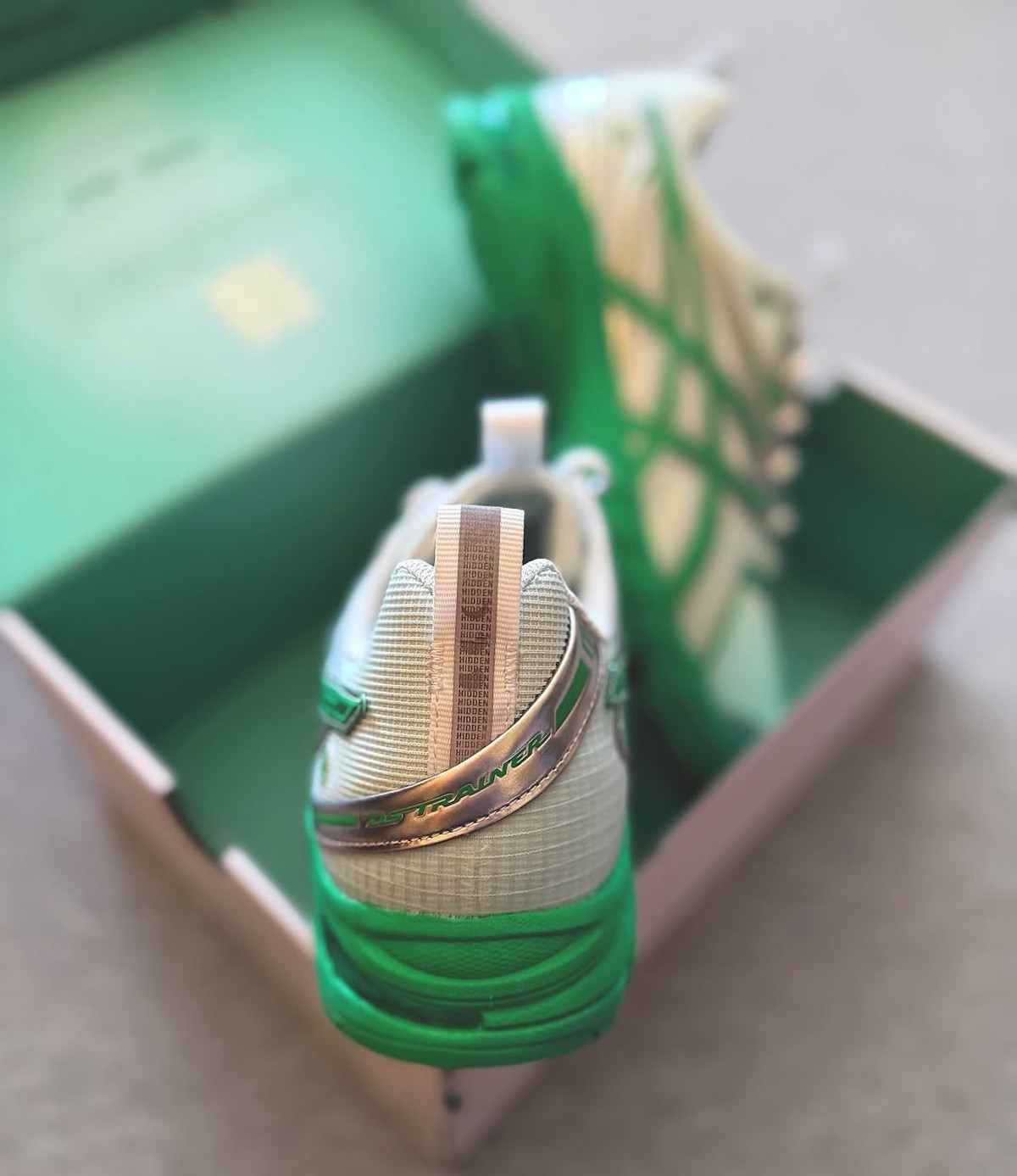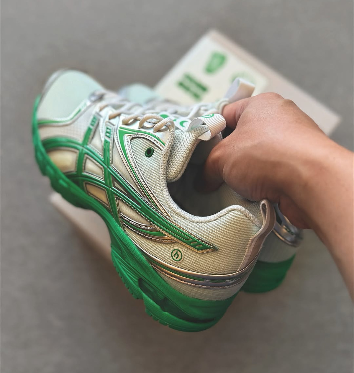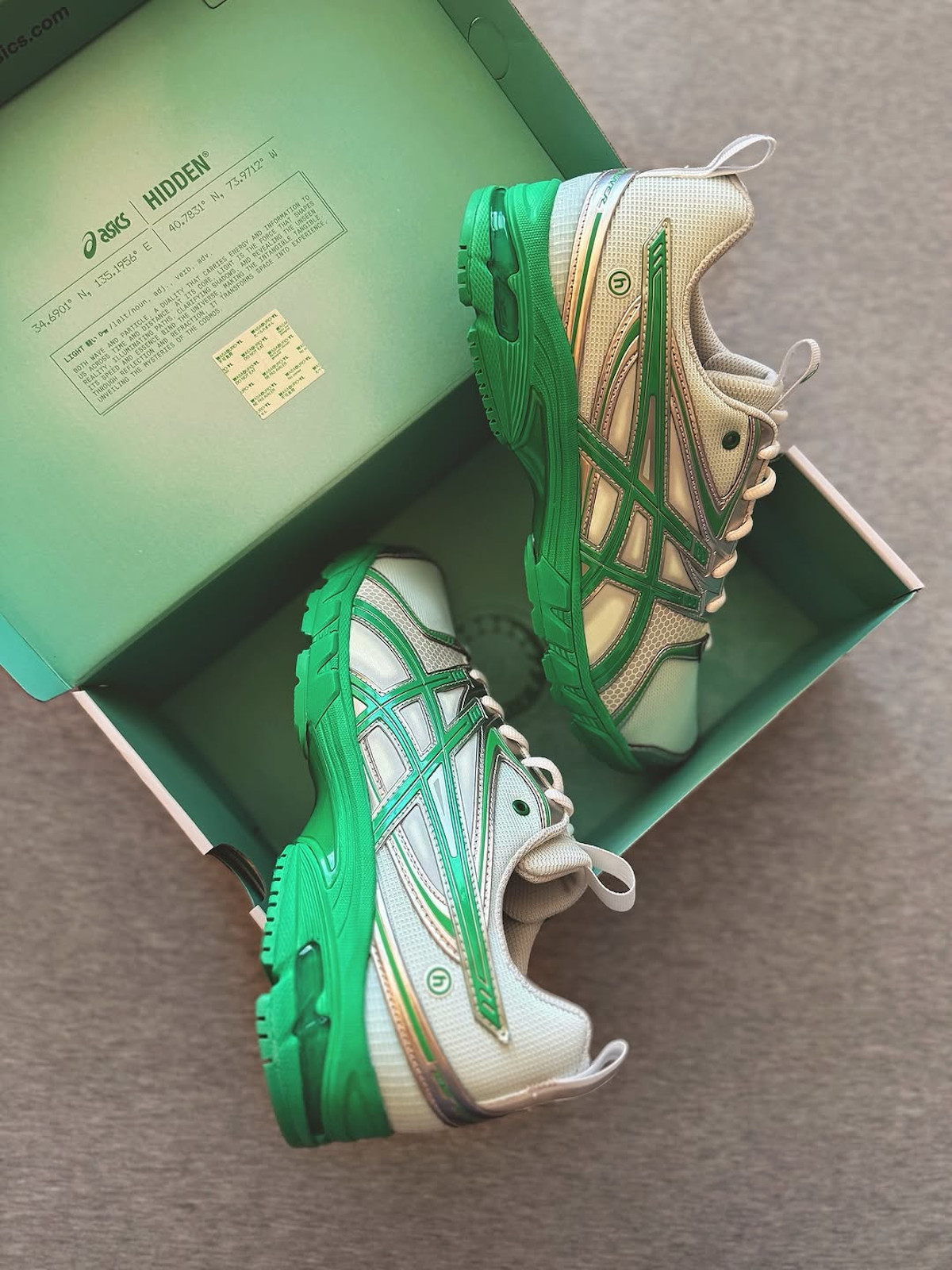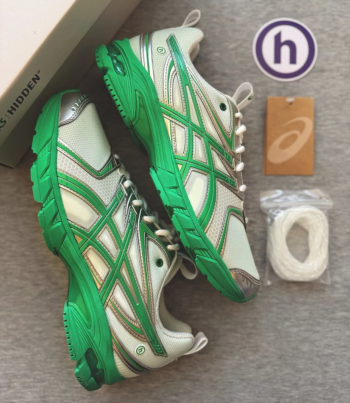 Comme dit en intro, la recette tient en trois ingrédients. La base se compose de en mesh blanc aéré. Les overlays argentés apporte une note lumineuse. On retrouve des touches de vert sur les logos et la semelle entière. Hidden NY ne réinvente rien. Ils appliquent leur formule habituelle, celle qui a déjà marché sur la Gel-NYC et la Gel-Venture 6.