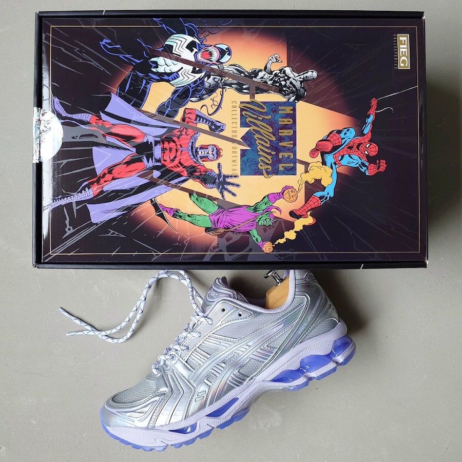 Suis-je trop exigeant ? Quelques uns s’extasient devant la Asics Gel Kayano 14 Silver Surfer, une collaboration entre Ronnie Fieg et Marvel. Je ne partage pas totalement leur enthousiasme face à l’édition limitée du pack Super Vilains. Elle est loin d’être vilaine cette Asics Gel Kayano 14 irisée. Son tort est de ne pas surprendre. Un lecteur de Comics et fan inconditionnel du personnage inventé par Jack Kirby pourra me comprendre. Par rapport à ce que représente le Surfer d’Argent, on s’attend à une paire d’un niveau galactique. L’aperçu exclusif que nous devons à Roseoxide me conforte dans cette idée. La sneaker iridescente reste estampillée « RF » donc les détails sont soignés. Si j’étais mauvaise langue je dirais que la boîte est plus réussie que la Kayano.