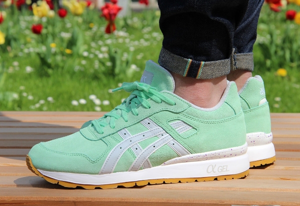 La collection Full Bloom comporte 3 sneakers (Asics Gel Lyte 3, Asics Gel Lyte V) et la GT II s’affiche comme la running la plus puissante. Sa partie supérieure se compose de suède vert pastel avec des accents gris. La semelle en gomme apporte un charme supplémentaire à ce modèle pour femme.