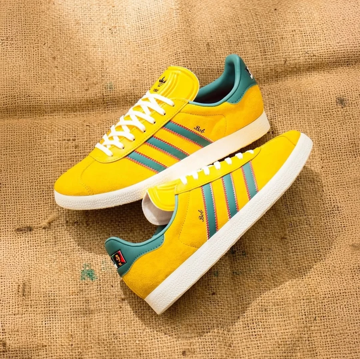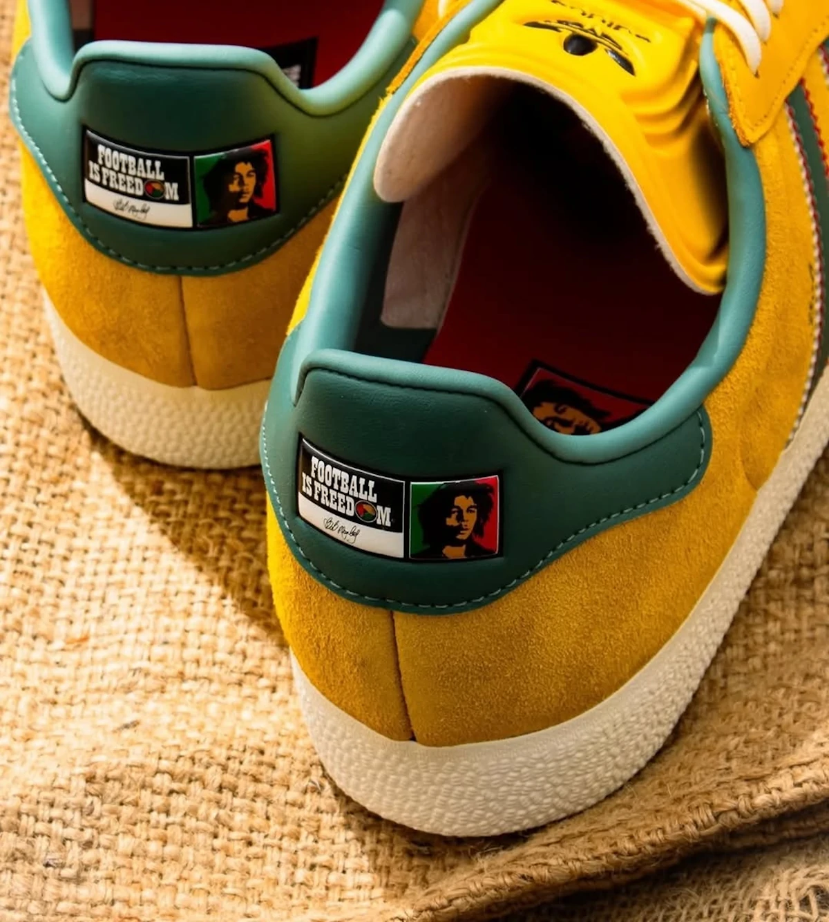 La partie supérieure de notre adidas Gazelle Jamaica x Bob Marley en daim « Bold Gold » affiche une texture veloutée. Les 3 bandes vertes portent de subtiles bordures rouges. Le move de génie ? Le « Bob » remplace « Gazelle » en typo cursive sur le flanc. Presque du jamais vu (je déconne). La languette arrière en cuir turquoise affiche un patch gravé « Football Is Freedom » avec le blaze du chanteur jamaïcain. La semelle de propreté rouge à l’intérieur poursuit l’histoire rastafari. La construction essaye d’être fidèle aux Gazelle de 1991. La languette moulée d’époque est bien présente. La semelle en caoutchouc maintient cet aspect vintage qu’on kiffe tous.