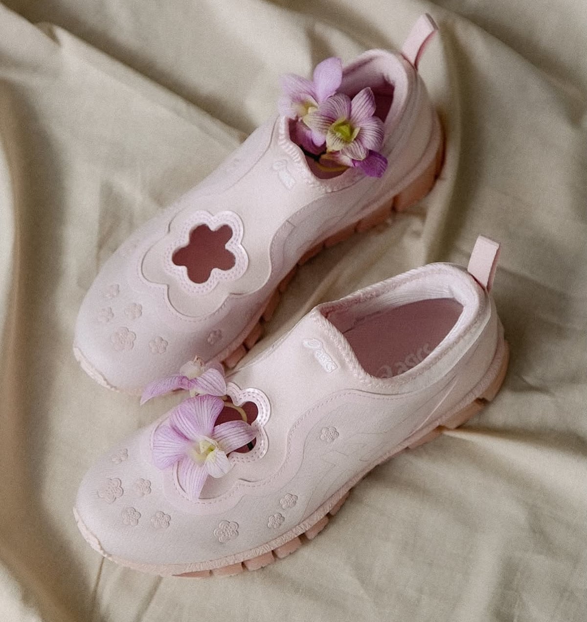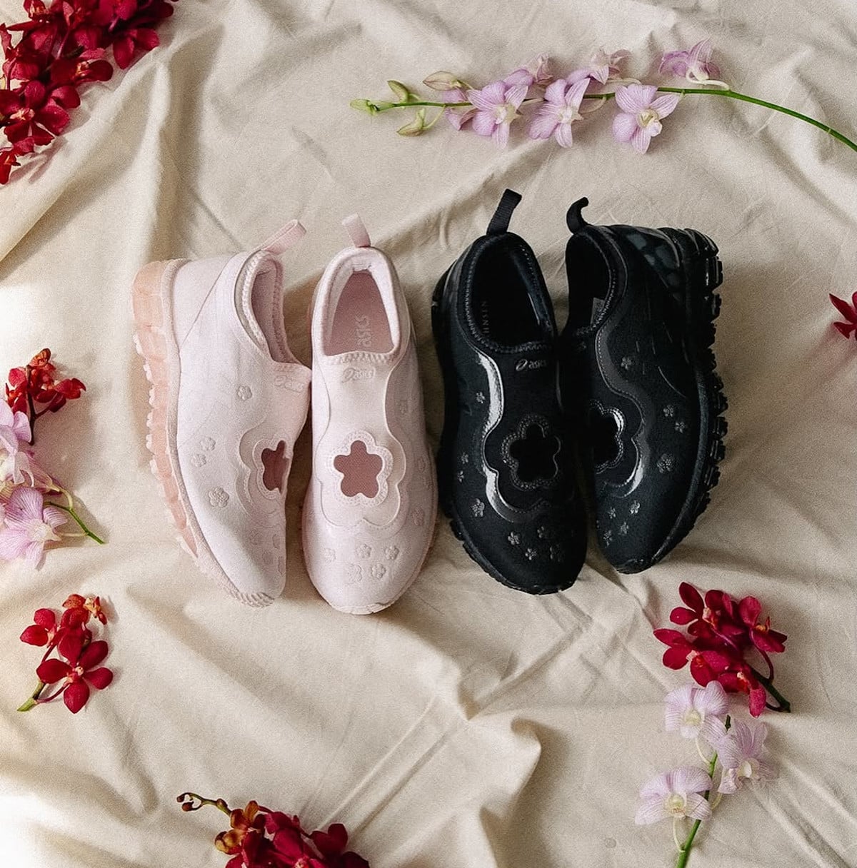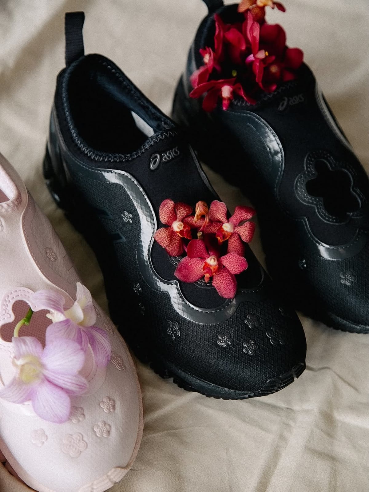 Mais elle ne s’est pas arrêtée au seul format. Ce serait trop simple. Pour maintenir une cohérence narrative avec les GT-2160 et Gel Cumulus qu’elle a sorties avant, Bahnsen a ramené ses fleurs . La découpe en forme de coquelicot sur l’empeigne, c’est le signe de reconnaissance de la collection. Visuellement c’est une belle réussite, ça va clairement prendre tout son sens cet été quand il fait chaud et que tu portes ça avec une jupe longue.