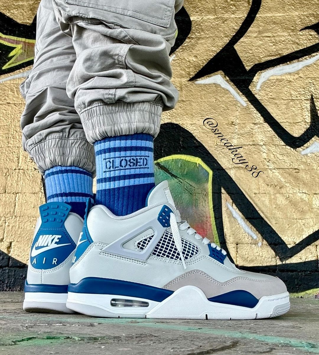 Pour le plus grand plaisir des adeptes des Air Jordan 4 Retro, le coloris Military Blue a effectué son retour début mai 2024. Je devrais l’appeler Industrial Blue mais j’ai du mal à me faire à ce nouveau nom. S’il a nourri des débats, le changement d’appellation n’a pas empêché les gens de se l’arracher. 12 années de disette, ça donne de l’appétit. Une basket bien blanche avec des accents bleus, que demander de plus pour le printemps. Vous vous demander comment styliser votre AJ4 Military Blue ? Vous êtes à la bonne adresse. Au-delà du fait que ces 20 photos seront d’une précieuse aide, elle nous font davantage aimer le classique de 1989.