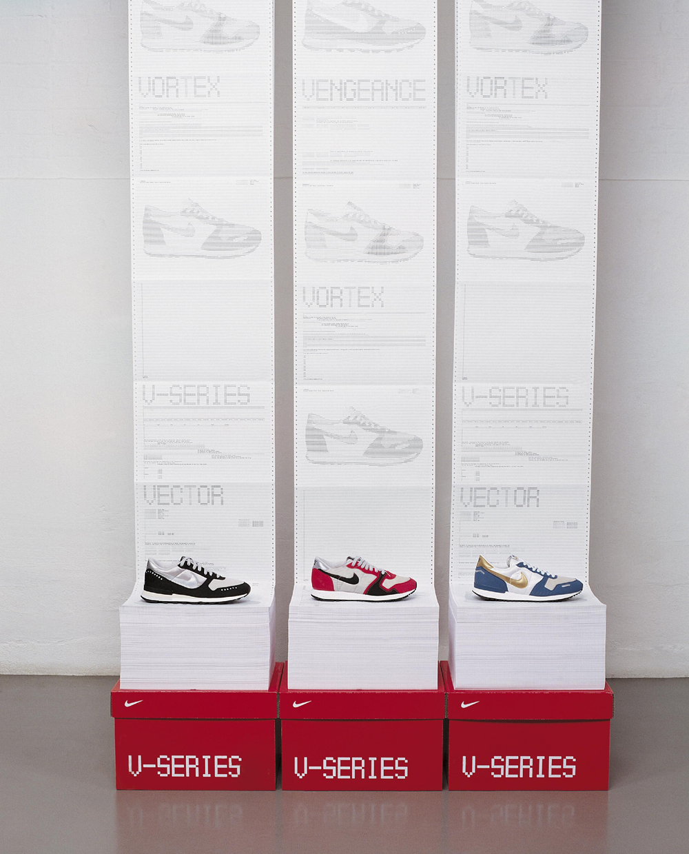 L’agence de design anglaise Spin a mis en scène de manière très originale les Nike Vengeance, Vector et Vortex.  L’ensemble a été rebaptisé V-Series . Il faut croire que la réédition de ces sneakers des années 80 constitue un évènement.  Pour plus d’images, vous pouvez relire mon article sur la collection running Nike  printemps été 2011.