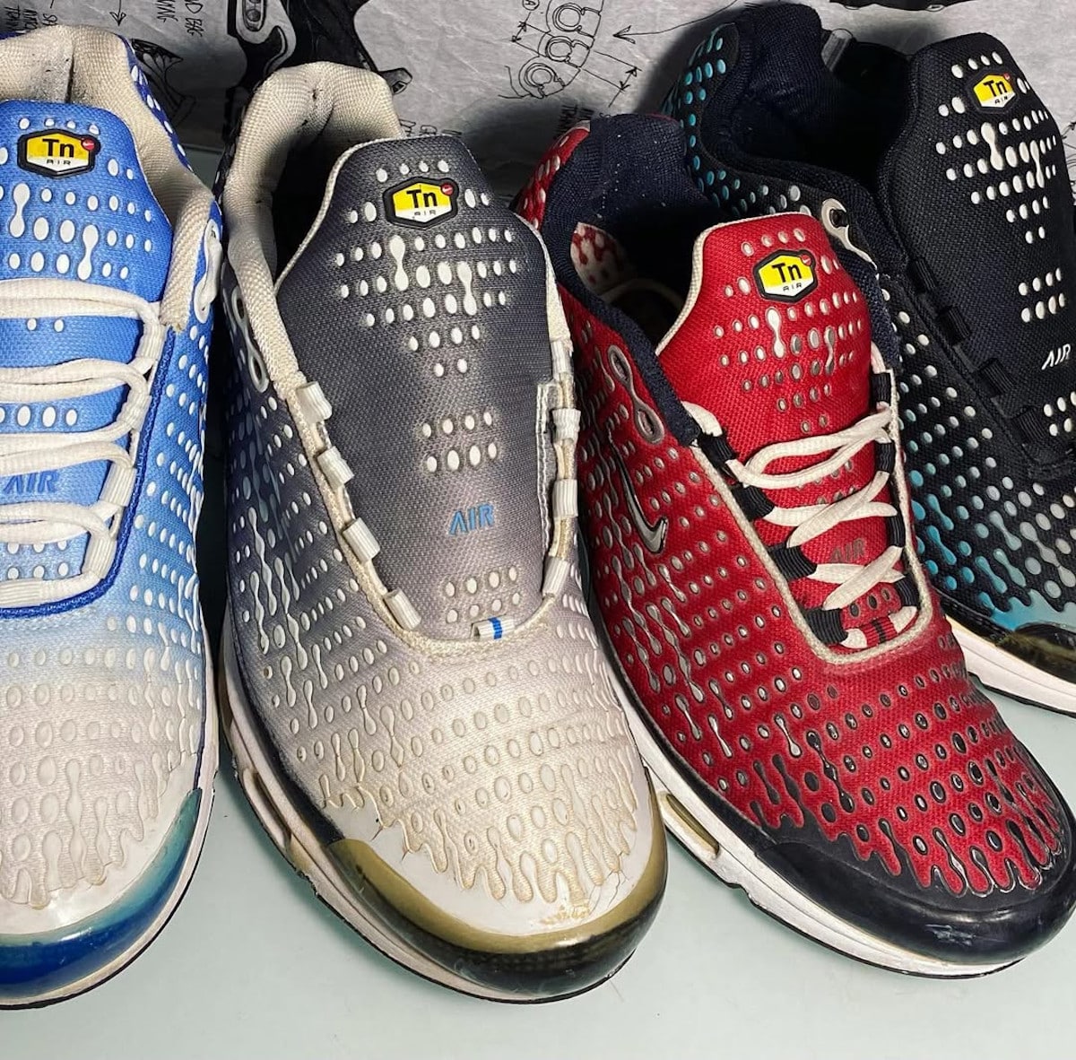 Sean McDowell dessine en 1998 une chaussure inspirée des palmiers de Floride et des vagues de l’Atlantique. Le résultat ? Un requin sous amphétamines. La cage ondulée en plastique rigide entoure le pied, le mesh respire, la semelle Tuned Air répartit les chocs. Les coloris explosent : Hyper Blue, Sunset etc…. La TN1 s’impose dans les rues françaises.