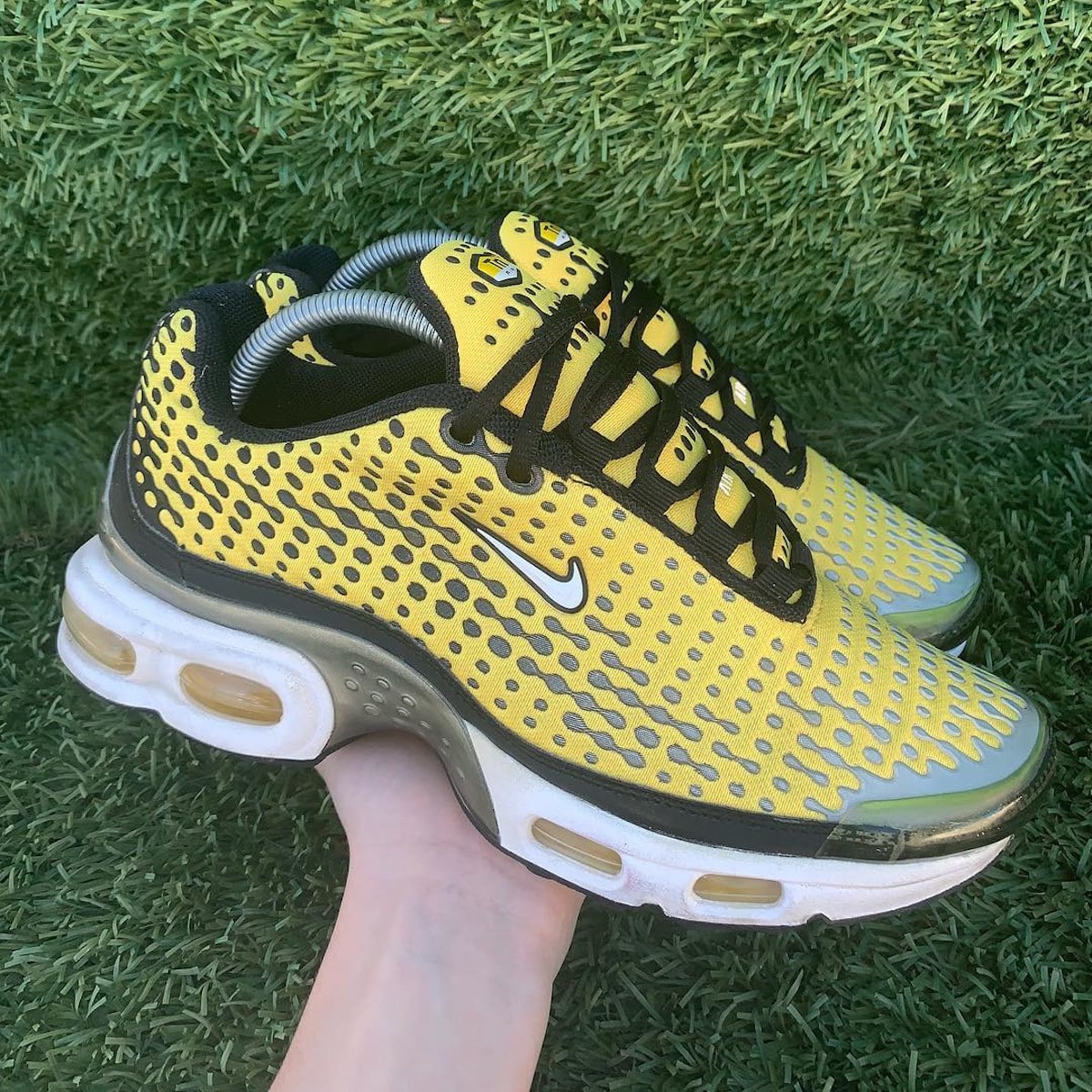 Sept ans plus tard, Nike tente un truc avec la TN7. Nous sommes en pleine air Y2K. Exit l’exosquelette, place à un mesh avec des renforts posés (des espèces de gouttes d’eau en TPU) stratégiquement. Plus léger, plus souple. La plaque de la semelle (le support en forme de queue de baleine) s’étire jusqu’au talon pour mieux stabiliser. Il en résulte une Requin qui garde l’esprit mais change de costume. Elle reçoit un accueil plus contrasté. Normal, difficile de faire sensation après la Air Max Plus première du nom.