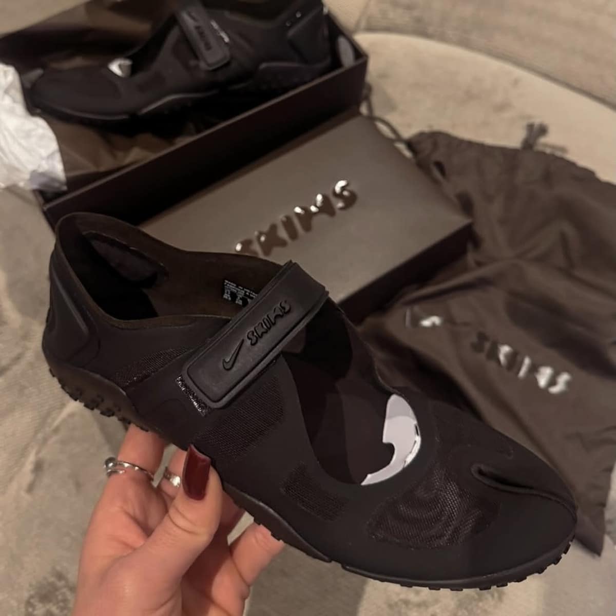 Déjà, parlons de l’élément le plus important : l’amorti Nike Air : rayé de la carte. La Rift OG embarquait une bulle d’air à l’intérieur du talon, ce petit coussin discret mais efficace, un peu comme un oreiller planqué dans ta chaussure. Avec la SKIMS, Nike a tout rasé pour une semelle super fine et une sensation pieds nus maximale (plus qu’une Nike Free ?). Quand tu marches, tu sens le sol, presque les pavés. Les fans de barefoot running se réjouissent. Les autres grimacent un peu, surtout après une longue journée debout.