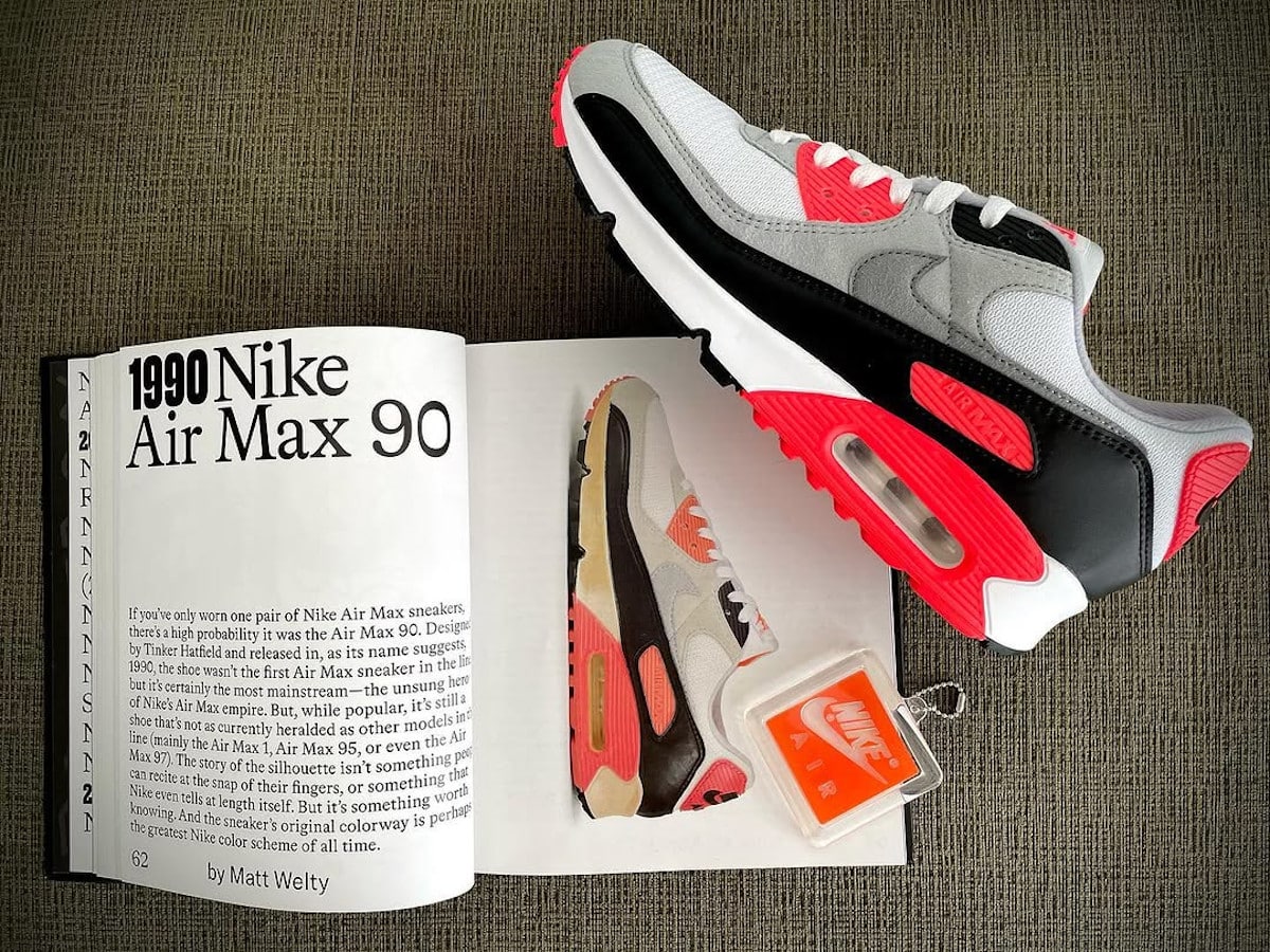 Nike balance sa gamme Air Max avec des bulles de plus en plus grandes, et Tinker Hatfield signe la Air Max 90 qui marque les esprits pour de bon. En Europe, le colorway Infrared devient culte instantanément. Les crews britanniques et français se l’arrachent sans même réfléchir.