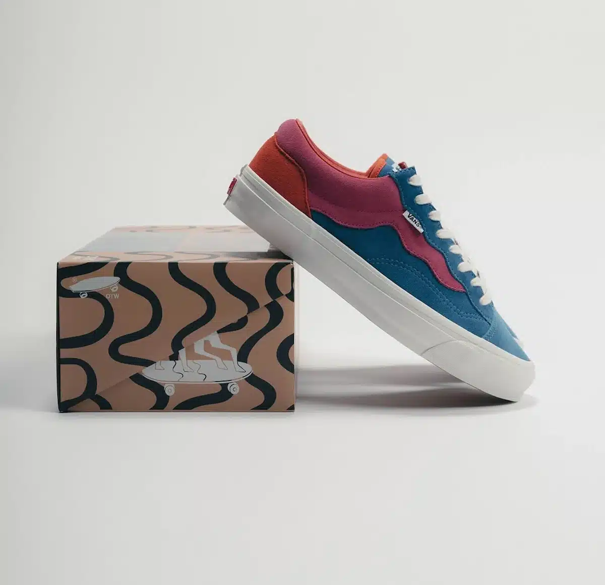 La sortie propose deux versions distinctes. D’abord la F&F grise, limitée à 300 paires, bonne chance pour mettre la main dessus. Ensuite la version pour des gens comme toi et moi, une édition multicolore qui balance du bleu, rose et orange. Des formes ondulées envahissent complètement la partie supérieure. Le Sidestripe disparaît déjà pour laisser place aux vagues. L’inscription gravée sur les semelles intérieures annonce la couleur : « Don’t forget to skate in these. » Venant de Parra, ça prend tout son sens.