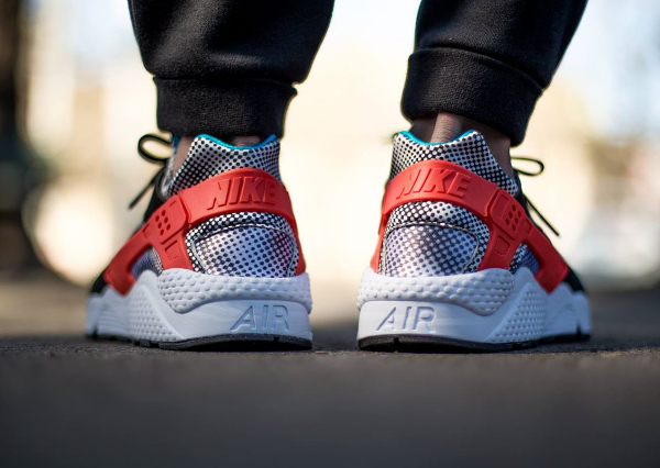 De plus en plus de sneakers Nike Lifestyle sont influencées par des paires de crampons : Free Hypervenom Mid, Air Footscape Magista, Free Mercurial Superfly… A cette liste, il faut à présent ajouter la Air Huarache FB Blue Lagoon/Bright Crimson. Comme la Air Max 1 Hypervenom Phantom, des motifs à pois sont appliqués sur certaines parties de la running. Ils contrastent avec la lanière rouge et le mesh noire de la sneaker. L’effet visuel est puissant.