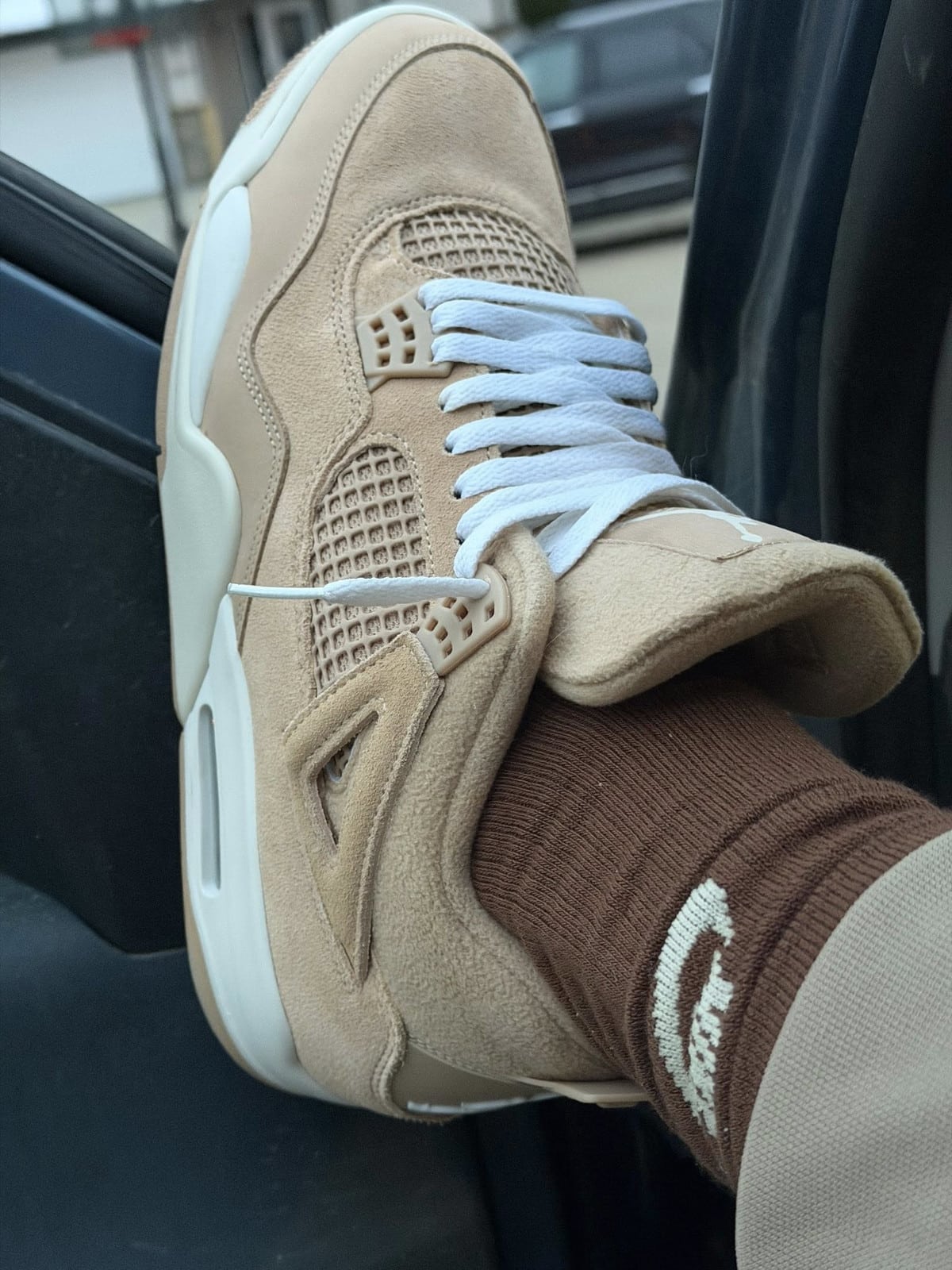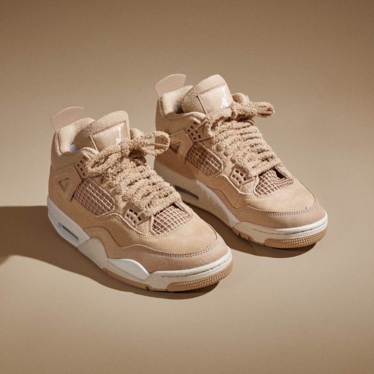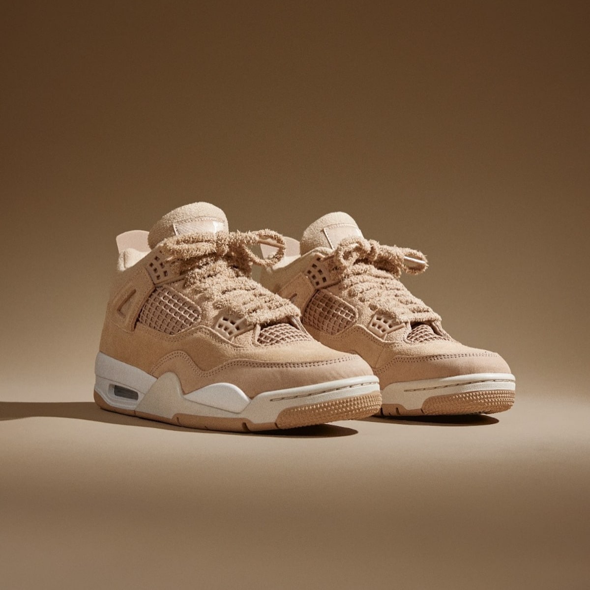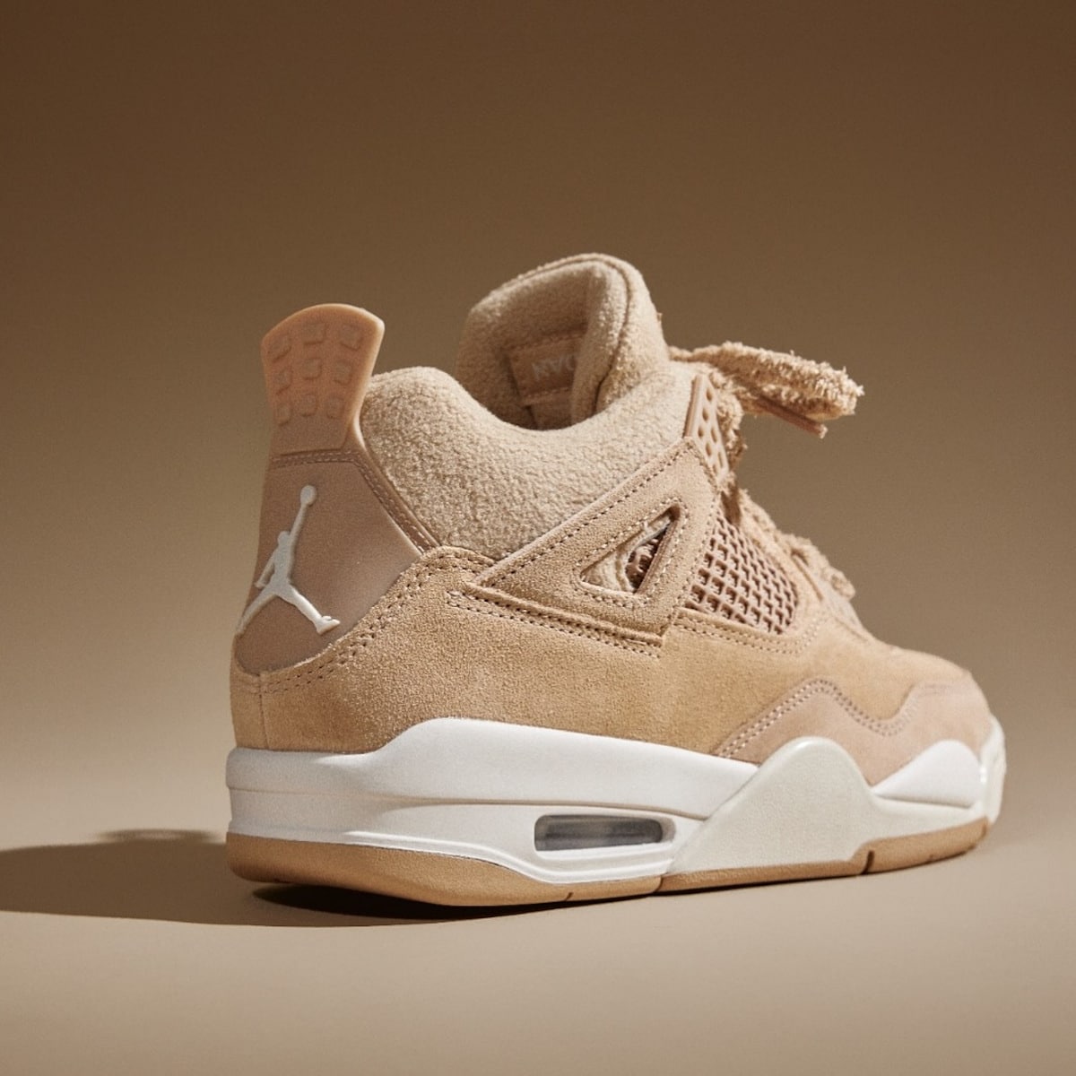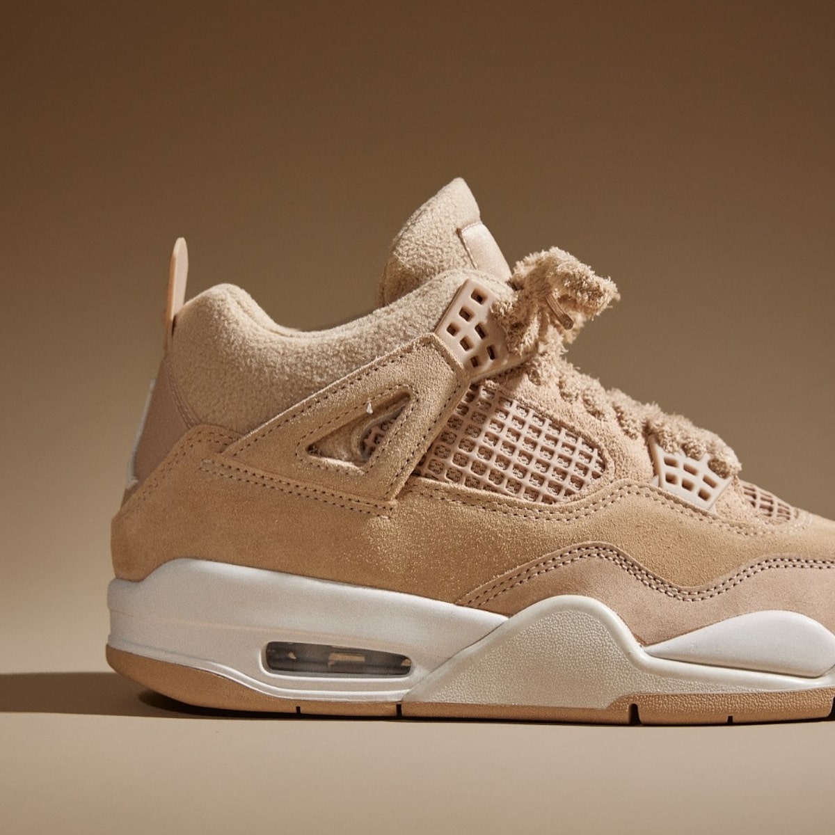 Le suède à poils longs chatouille les doigts comme la fourrure d’un chien golden retriever. Jordan Brand a poussé le délire jusqu’aux lacets ayant un aspect pelucheux. Ces ficelles ressemblent à des cordons de peignoir cinq étoiles. Épaisses, texturées, moelleuses comme un peignoir. La doublure molletonnée complète le tableau. Glissez le pied dedans. C’est comme rentrer chez vous après une journée pourrie. Confort immédiat, chaleur instantanée. Même les mesh panels adoptent la teinte beige. Tout se fond dans cette harmonie caramel.