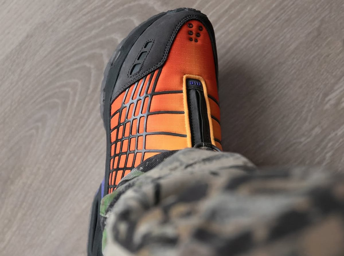 - Détails du design et des matériaux : tige en nylon indéchirable avec un exosquelette en plastique quadrillée, dégradé évoquant un coucher ou un lever de soleil, chiffres « 3062 » sur la languette en référence au numéro de téléphone communautaire de KOI, slogan « JUST DO IT. TOGETHER » sur les semelles intérieures.