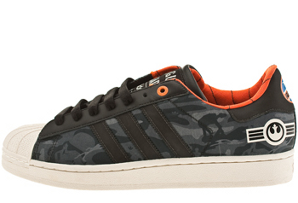 Le thème de cette sneaker est le combat sur la planète Hoth. Les emblèmes Rogue Squadron et de l’Alliance rebelle figurent sur cette Adidas Superstar 2.
