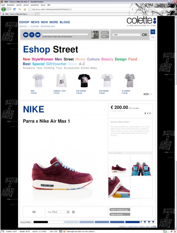 La Air Max 1 Patta x Parra est sans conteste l’undes meilleurs modèles de l’année 2010…. Sortie en très peu d’exemplaires, seulement quelques veinards peuvent se vanter de l’avoir…. Perso, j’ai trouvé cette page réalisée sur Photoshop d’un très mauvais goût…. Et oui, je suis un méchant rageur…